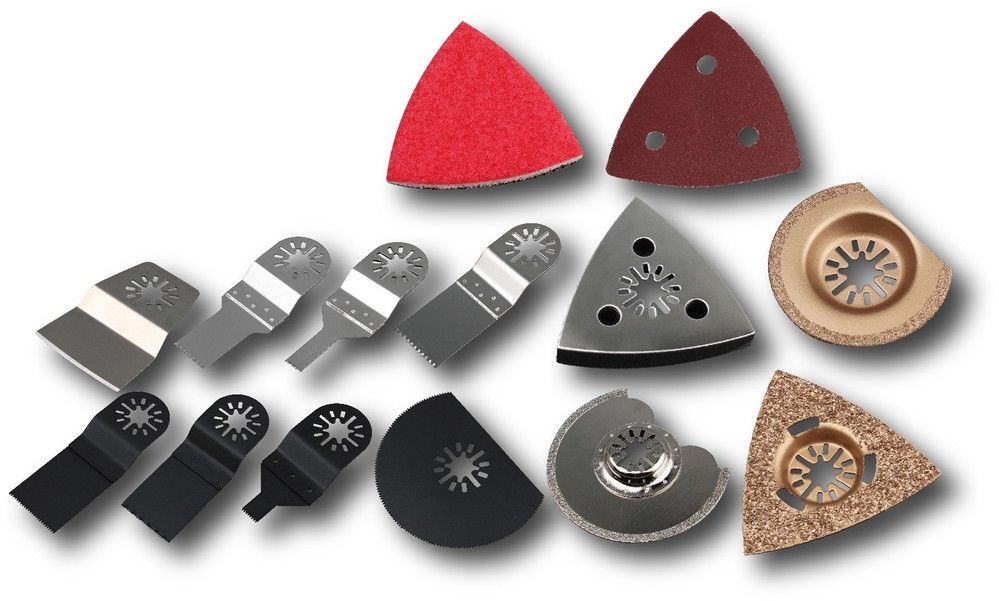 Čtyřiceti dílná sada nástavců k oscilační brusce Fieldmann FDB 2005-E, která se skládá z nástavce na broušení, leštící podložky, pilových kotoučů kulatého tvaru, pilových listů pro výřezy otvorů do desek nebo sádrokartonů, nožů špachtlovitého tvaru pro odřezávání starých koberců nebo linoleí z podlahy, diamantové nástavce na vyřezávání dlaždic a obkladaček i broušení ztvrdlé lepící hmoty. Nástavce jsou kompatibilní oscilačními bruskami jiných značek.