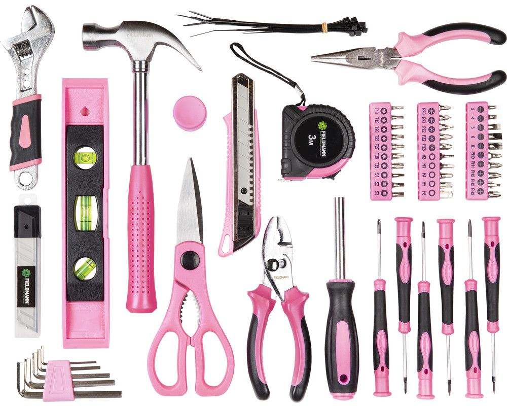 Stylová růžová brašna FIELDMANN v sobě ukrývá 71 dílnou sadu nářadí, která se bude hodit nejen každé kutilce, ale též každému členu domácnosti nejen v rodinné dílně, ale též na zahradě. Sada obsahuje šroubováky, bity, kladivo, kleště, nožík, svinovací metr,vodováhu a spoustu dalšího vybavení, bez kterého se praktická žena v domácnosti prostě neobejde. Jednotlivé nářadí je vyrobeno z odolného materiálu a opatřeno pohodlnými ergonomické úchopy.