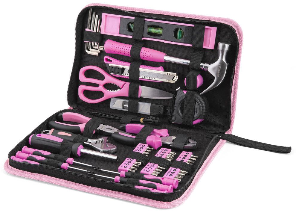 Stylová růžová brašna v sobě ukrývá 71 dílnou sadu nářadí, která se bude hodit nejen každé kutilce, ale též každému členu domácnosti nejen v rodinné dílně, ale též na zahradě.