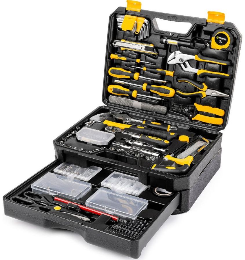 Od výroby dřevěných dekorací až po sestavování kovových konstrukcí, s pomocí klíčů, pilníků, kleští a vrtáků, se vaše nápady promění v realitu. Sada také obsahuje univerzální kloub, prodlužovací tyče, nůžky, kabelové sponky, izolační pásku, dřevěnou tužku, 3m měřicí pásmo, pilu a mnoho dalších vychytávek, které vám poskytnou vše, co potřebujete pro úspěšné dokončení vašich projektů. Navíc je každé nářadí vybaveno pohodlnou ergonomickou rukojetí pro váš maximální komfort i při dlouhodobém používání.