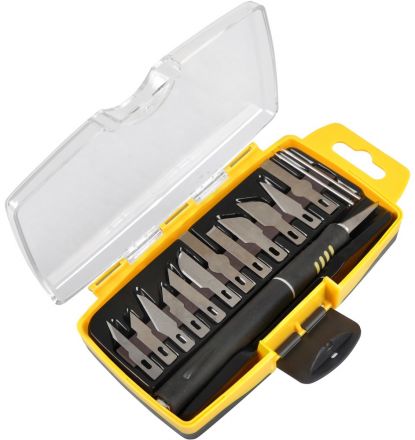 Sada hobby nožů je vybavena 13-ti čepelemi různých tvarů a 2 jehlami.