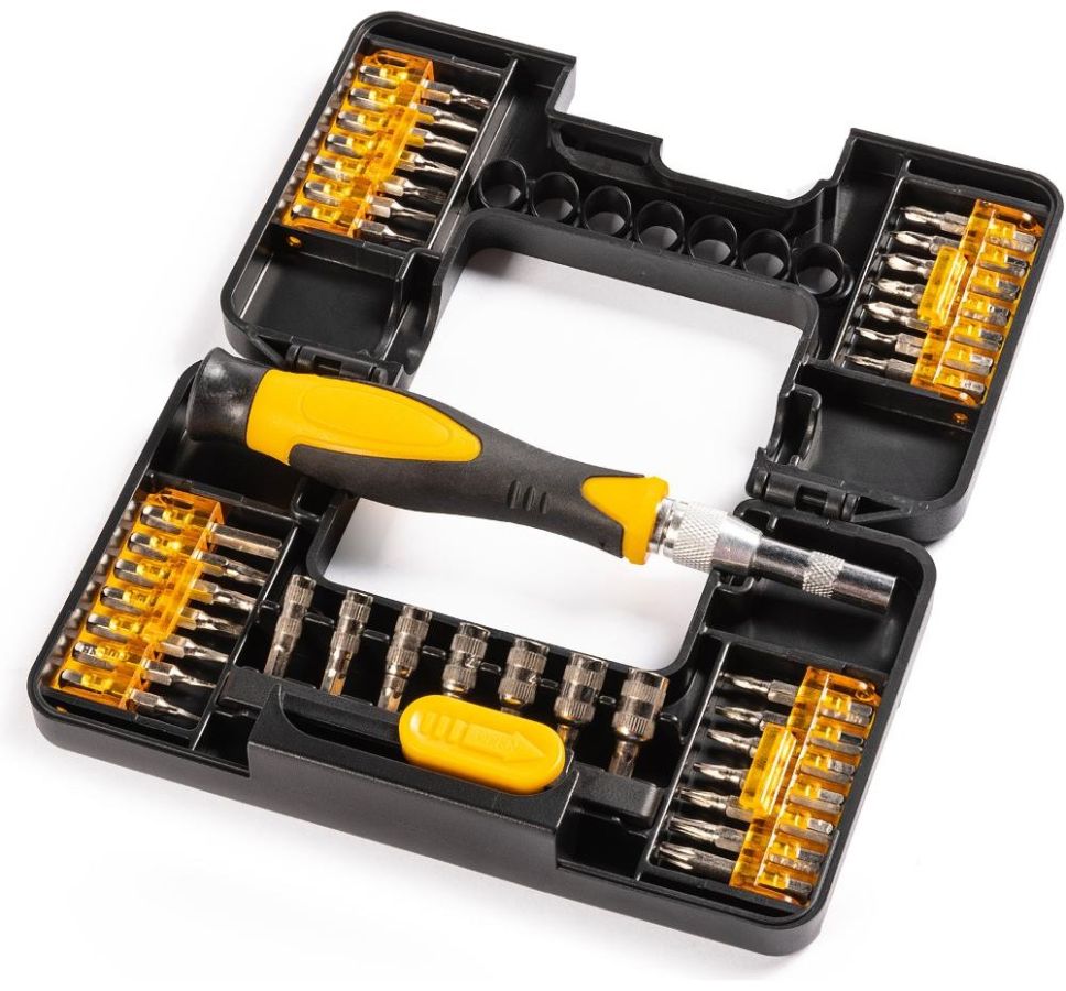 Sada šroubováku s bity obsahuje ploché hlavy, šestihranné hlavy, torx a šestihranné matice.