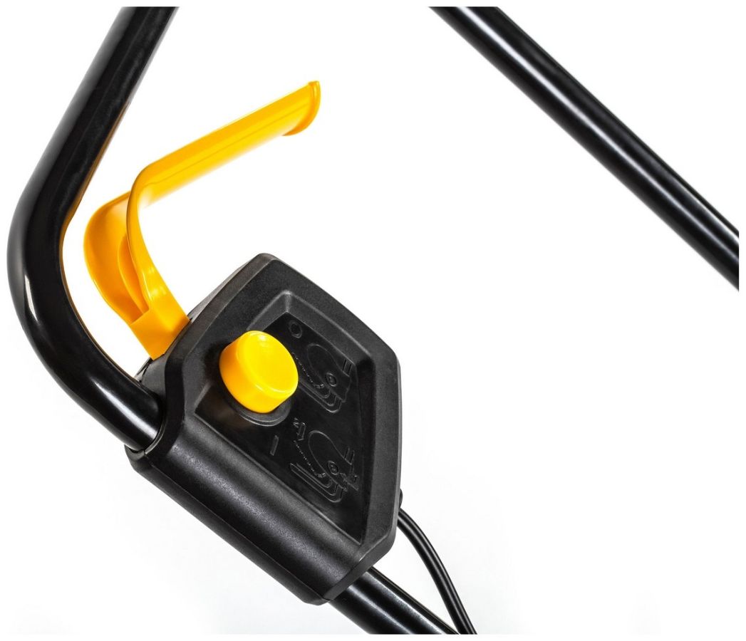 Nastavení výšky sečení je možné ve 3 polohách, a to v rozmezí 25-60 mm. V přední části je umístěno závaží, které zabraňuje převažování sekačky, když je koš zaplněn. Sklopné madlo je opatřeno držákem kabelu, který zabraňuje samovolnému uvolnění elektrické zástrčky v průběhu práce. Součástí spínače sekačky je pojistka zabraňující nechtěnému spuštění stroje.