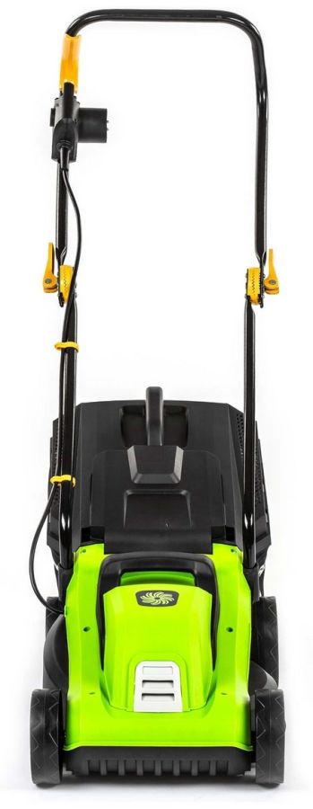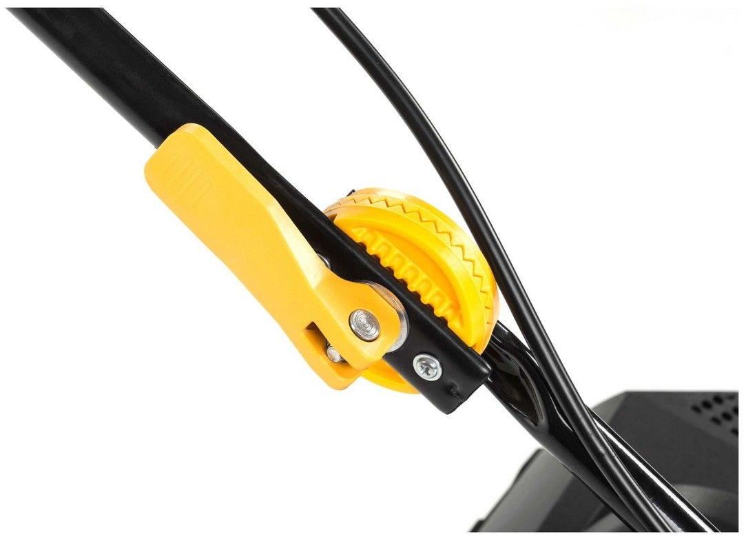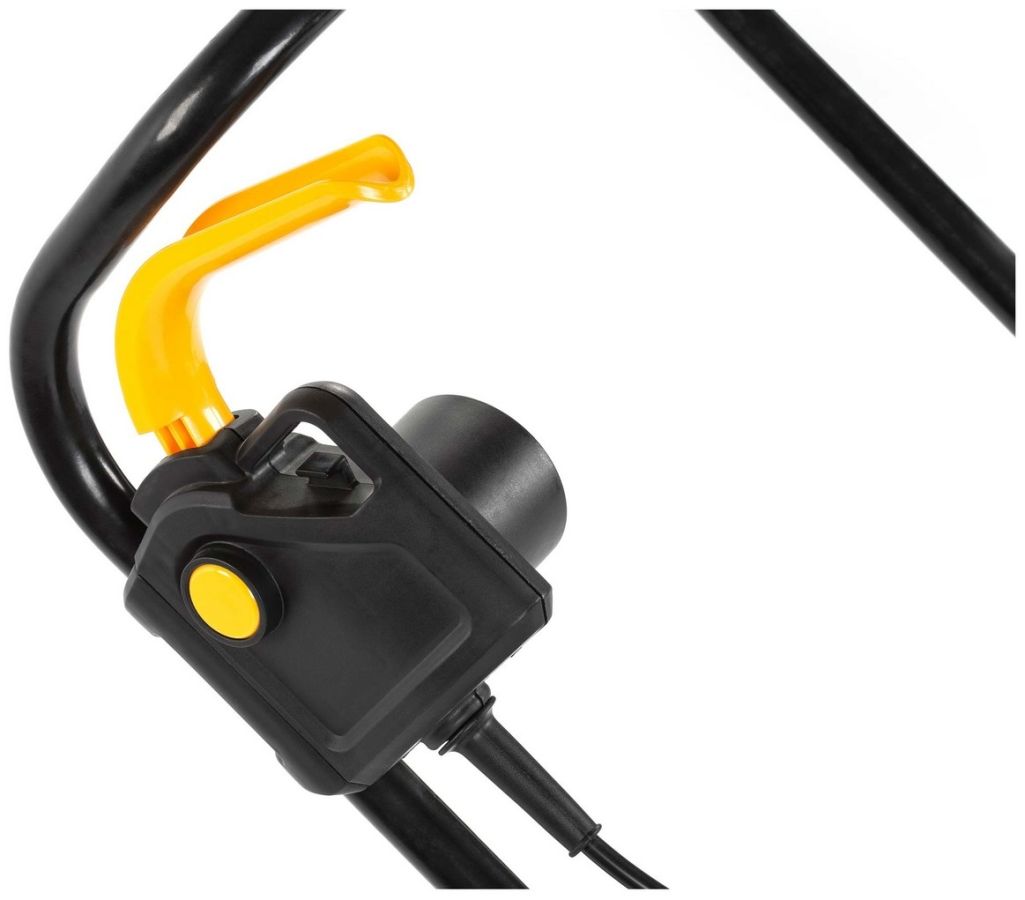 Sklopné oblé madlo je ergonomicky tvarované, lépe se drží a sekačka se tak snáze tlačí. Madlo je opatřeno držákem kabelu, který zabraňuje samovolnému uvolnění elektrické zástrčky v průběhu práce. Spínač sekačky je vybaven bezpečnostní pojistkou zabraňující nechtěnému spuštění stroje. Transportní madlo je umístěno v těžišti sekačky, což usnadňuje její přenášení.