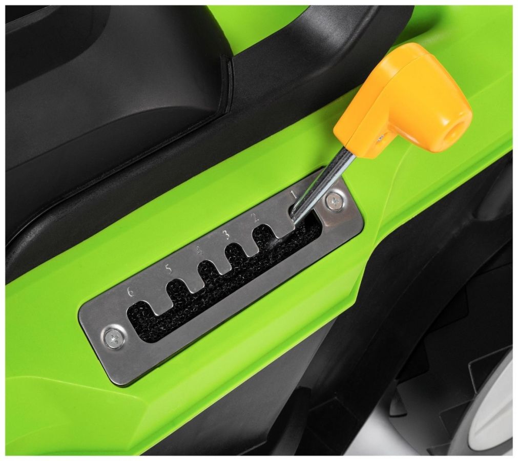 Tato novinka je osazena silnějším 1600 W motorem a i díky záběru 38 cm si troufne na větší trávníky až do 800 m². O komfortní provoz se starají tradiční uživatelské žádané funkce, jako je sklopné madlo pro pohodlné převozy a uskladněný, centrální nastavení výšky sečení do 5 poloh či velký látkový sběrný koš (45 l) se signalizací zaplnění.