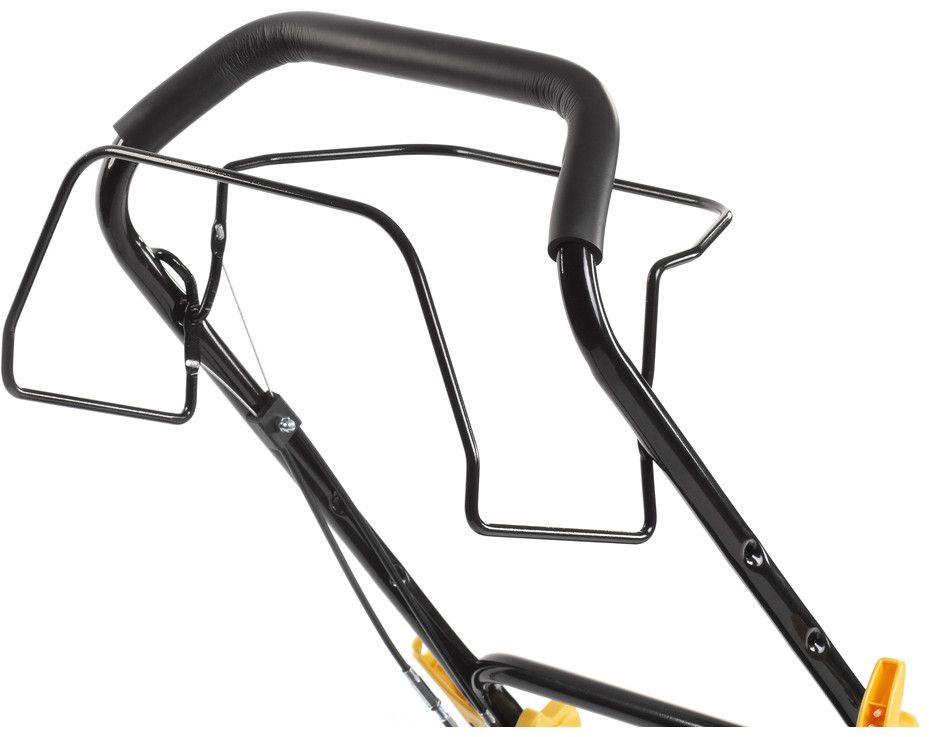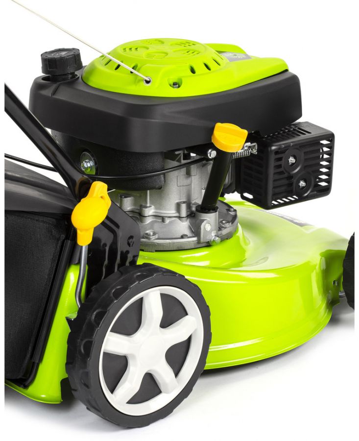 Součástí výbavy sekačky je systém 3 v 1, který umožní kromě sběru trávy do sběrného koše o objemu 55 l či mulčování ještě zadní odhoz trávy. Snadné ovládání motoru i pojezd sekačky zajistí dvojice pák přes celou šířku madla. Kola jsou uložena na kuličkových ložiscích. Komfort při práci zajišťuje měkčený potah madla tlumící vibrace.