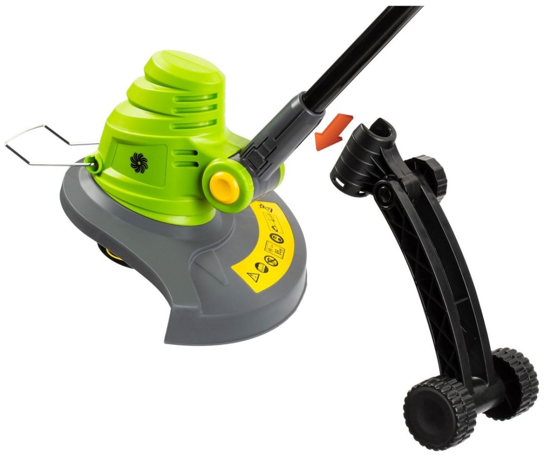 - Obsah balení: strunová sekačka, kolečka, žací hlava se strunou, rukojeť, umělohmotný kryt, sada pro montáž