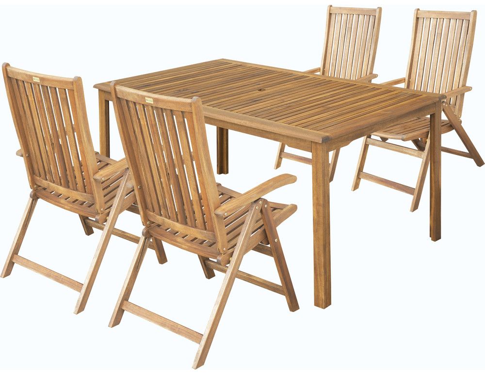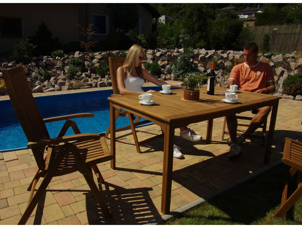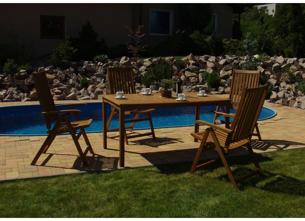 Oblíbená sestava zahradního nábytku složená z obdélníkového stolu a čtyř křesel. Stůl o rozměrech 90 x 150 cm je opatřen standardním otvorem pro umístění slunečníku. Opěradlo ergonomicky tvarovaného křesla je možné nastavit v 5 polohách pomocí posunu loketních opěrek.