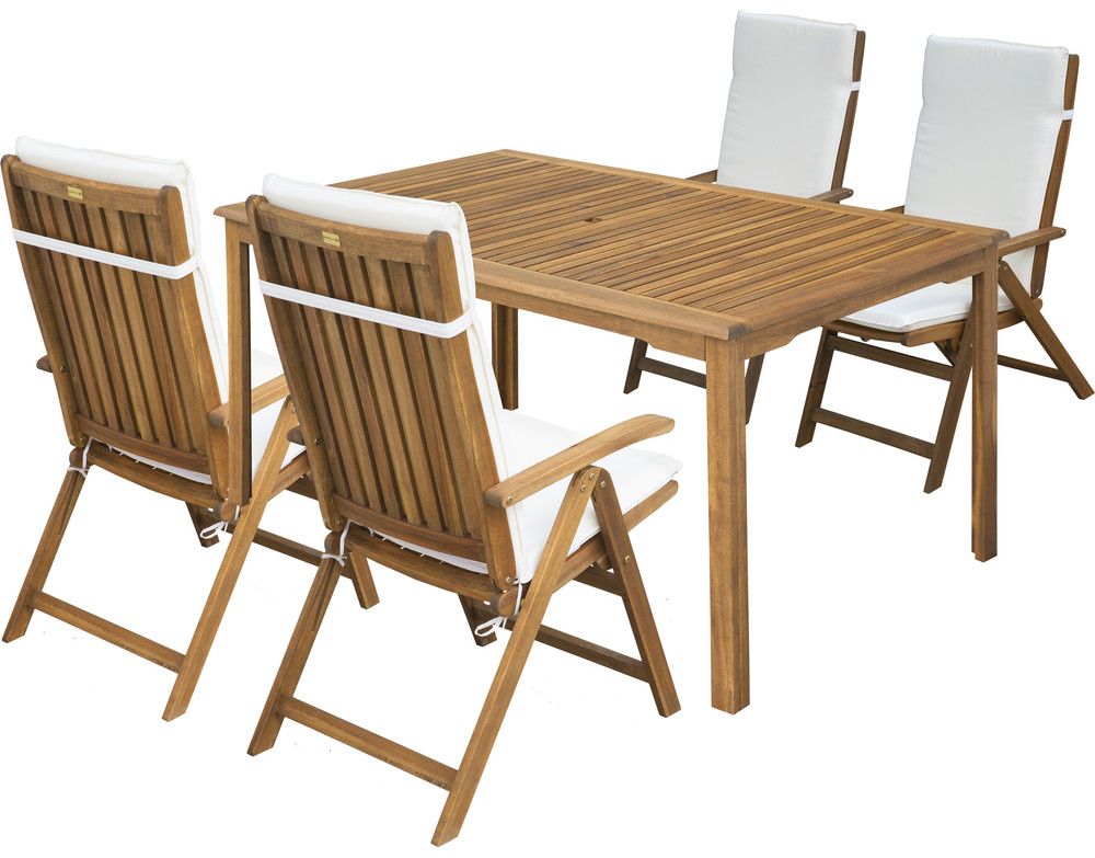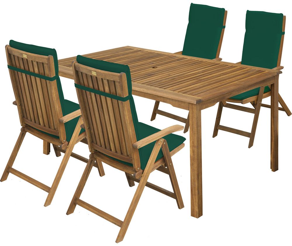 Ke křeslům je možné dokoupit pratelné potahy zelené a bíle barvy. Stůl i křesla jsou vyrobeny z tropické dřeviny Akácie. Toto velice tvrdé dřevo bez problémů odolává i nepřízni povětrnostních vlivů a předurčuje tento nábytek k venkovnímu použití.