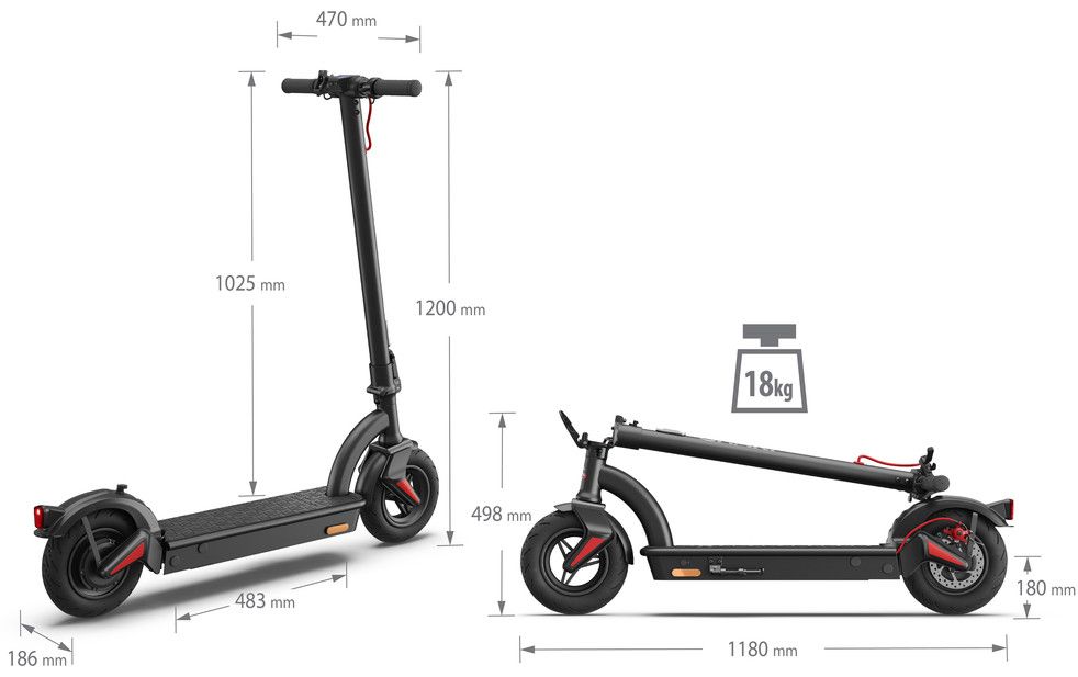 Elektrická skládací koloběžka s výkonem 350W a rychlostí až 25 km/h, nosností 120kg a dojezdem až 40 km.