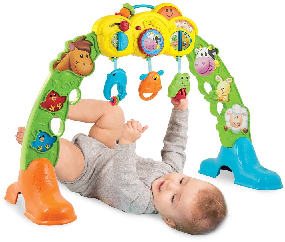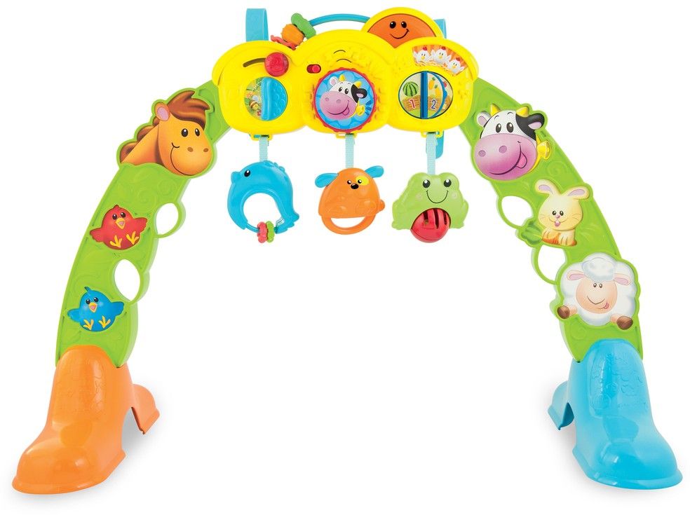 - snímatelná chrastítka - Robustní dětské cvičební nářadí s pestrými zvířátky z farmy