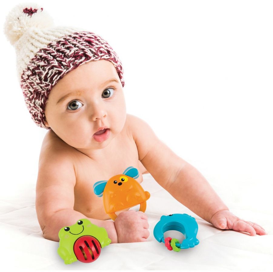- 3 snímatelná závěsná chrastítka ve tvaru zvířátek