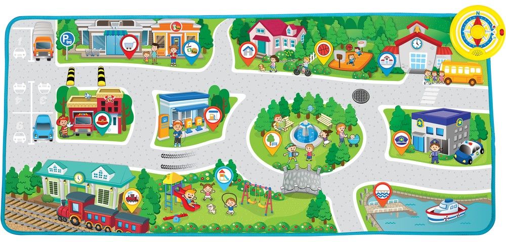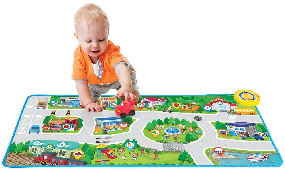 Hrací podložka s motivy rušného města se zábavnými zvuky a posunovacím autíčkem.