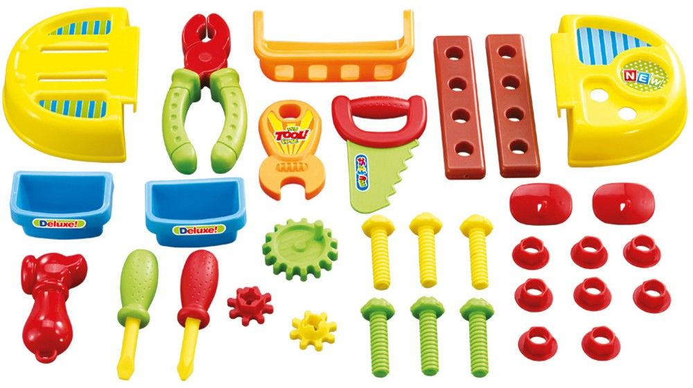 Kufřík lze použít také jako stoličku pro hravé děti. Sada obsahuje pilu, kleště a šroubováky, dále pak soustu šroubů a matek. Všechno toto příslušenství můžete uklidit zpět do stoličky.