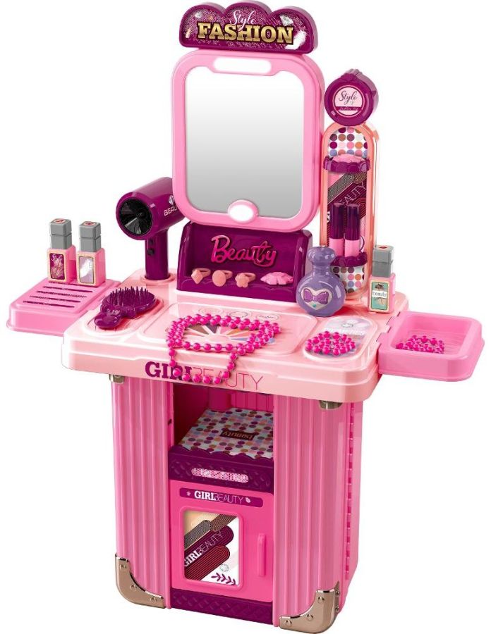 - Salon lze saložit do praktického kufříku nebo postavit jako kosmetický stolek. Díky této variabilitě si děti mohou vybrat, jak si se stolkem budou hrát. Snadno se přenáší pomocí praktického ouška a koleček. Kufřík zároveň pomáhá udržet všechny věci pohromadě.