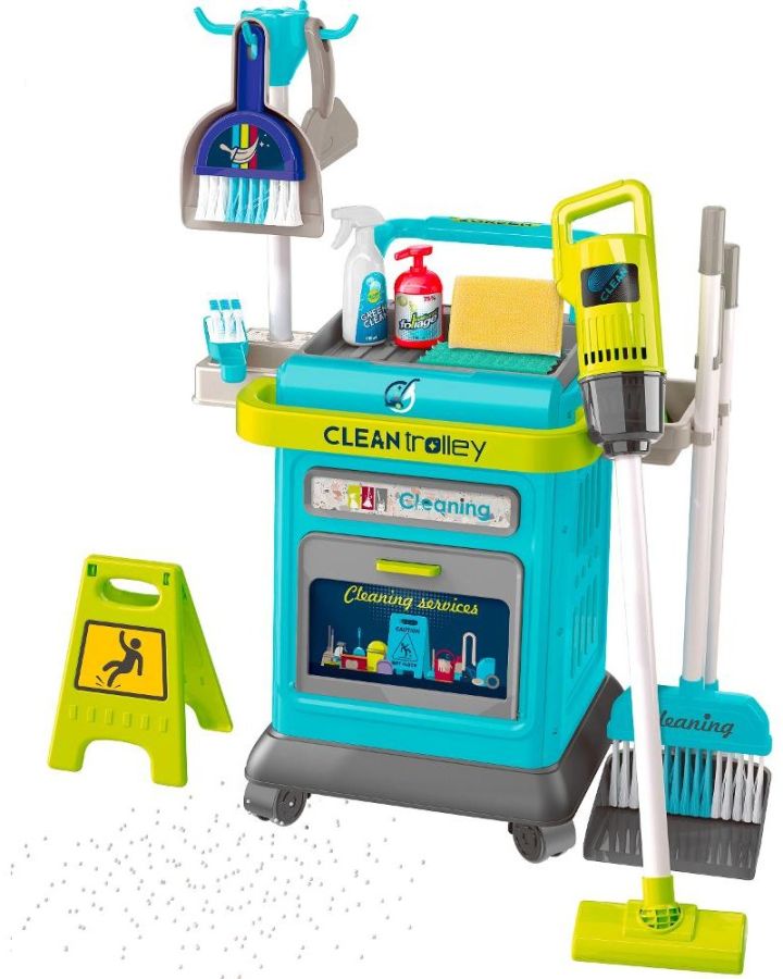 - Úklidový vozík na kolečkách obsahuje vše, co malí pomocníci potřebují pro úklid. Najdou v něm různé čisticí pomůcky a doplňky, se kterými si mohou hrát na uklízeče.