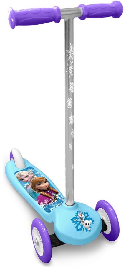 Dětská naklápěcí koloběžka s licencí filmu Frozen. Zatáčí se pomocí naklápění, to pomáhá učit rovnováhu a koordinaci. Tři kolečka jsou zárukou snadné, stabilní a bezpečné jízdy menších děti. Blatník v zadní části koloběžky slouží i jako brzda. Výška řídítek 63 cm, váha 1,83 kg, nosnost 20 kg plastová kolečka s ložisky ABEC 5.