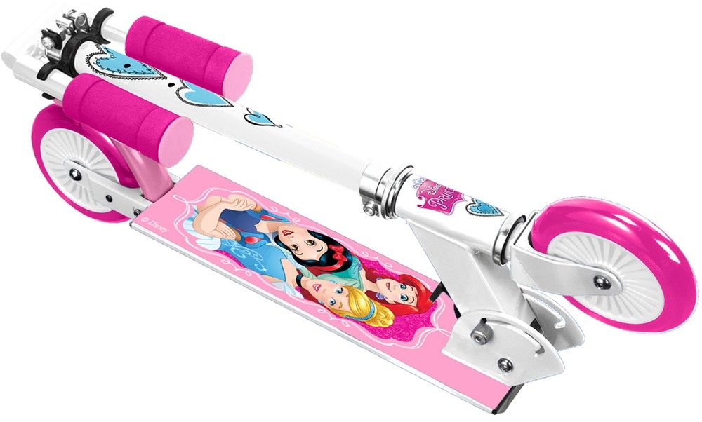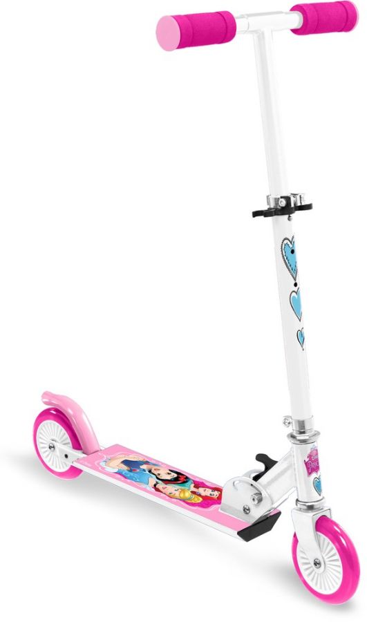 Skladná, praktická a velmi lehká (2,1 kg) skládací koloběžka. Ideální pro holky – s motivem Disneyho princezen. Je vybavena silnou, vyztuženou kostrou a protiskluzovou odrážecí deskou s praktickou brzdou ve formě zadního blatníku. Řídítka mají pěnové rukojeti a jsou nastavitelná do výšky 69 -73 cm. Kolečka jsou plastová, opatřená ložisky ABEC 5.
