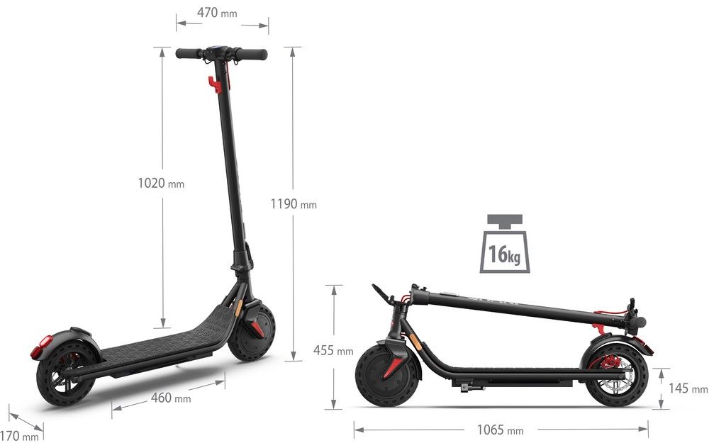 Elektrická skládací koloběžka s výkonem 350W a rychlostí až 25 km/h, nosností 120kg a dojezdem až 20 km.