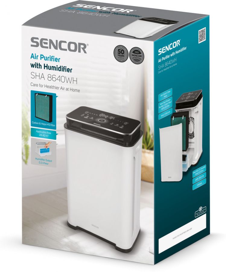 Čistička a zvlhčovač vzduchu Sencor SHA 8640WH se čtyřmi rychlostmi čištění zajistí komplexní péči o kvalitu prostředí v bytě i v kanceláři. S přehledem filtruje vzduch v prostoru o velikosti až 42 m². Vícestupňové čištění vzduchu je vysoce efektivní. Vzduch proudí přes vstupní filtr, uhlíkový filtr a konečně HEPA filtr, který vyřeší až 99,97% prachu, pylů, alergenů a spórů plísní. Celý postup se završí spuštěním funkce UV lampy, která likviduje viry a bakterie. Nakonec lze místnost osvěžit ionizací. Zvlhčovač vzduchu je shopen pokrýt až 290 m3 prostoru za hodinu provozu. Optimálně zvyšuje okolní vlhkost a umožní pohodlné dýchání.