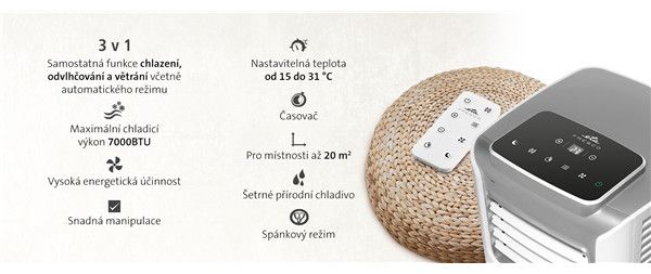 Mobilní klimatizace 3 v 1 s vysokou účinností ochlazuje vzduch, snižuje relativní vlhkost, případně funguje jako obyčejný ventilátor. Má 2 rychlostní stupně, dotykové ovládání, LED displej a je určena pro místnost do cca 20 m2.