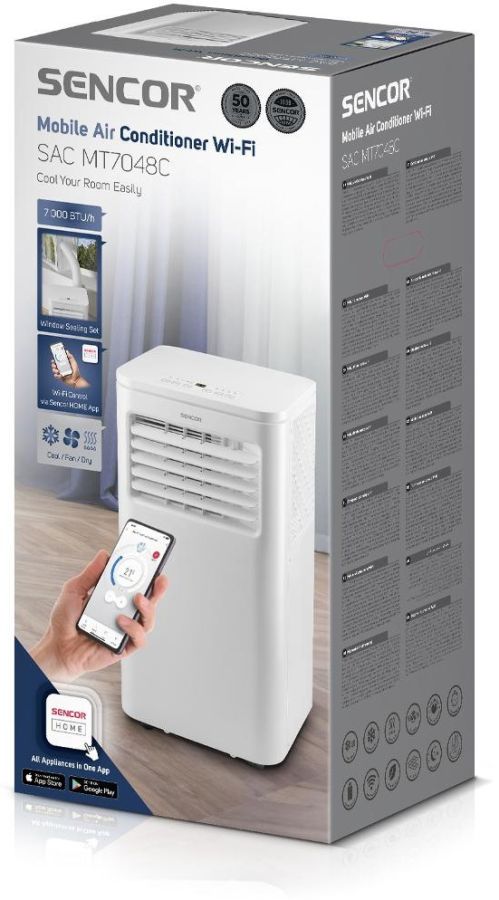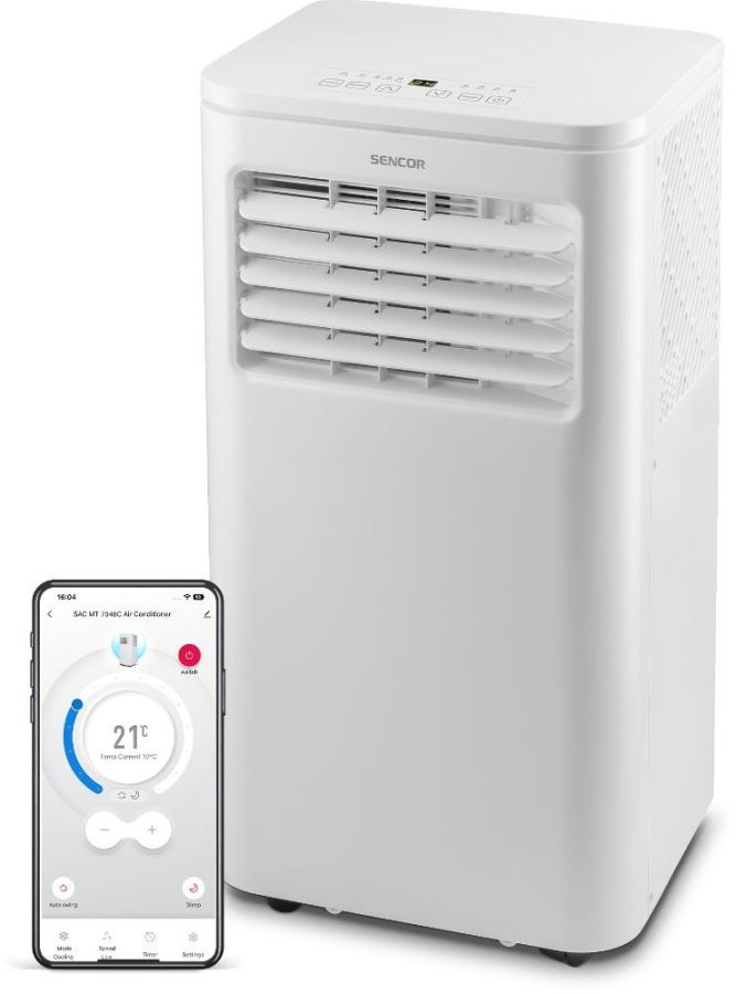 Ideální parťák do horkých letních dní, ale i úspěšný bojovník s vlhkostí? Představujeme vám mobilní klimatizaci Sencor SAC MT7048C. Disponuje chladícím výkonem 7 000 BTU/h, díky kterému ideálně funguje v místnostech o rozloze až 26 m² ( 54 - 67 m³). U této klimatizace máte na výběr 3 režimy. Jsou jimi Chlazení, Ventilace a Odvlhčování. Mezi funkcemi, které jistě bohatě využijete je i Časovač a Spánek. Klimatizaci pohodlně ovládejte na dálku chytrým telefonem prostřednictvím Wi-Fi a aplikace Sencor HOME. Ke konfortnímu nastavování všeho, co potřebujete, slouží ovládací panel nebo dálkový ovladač.
