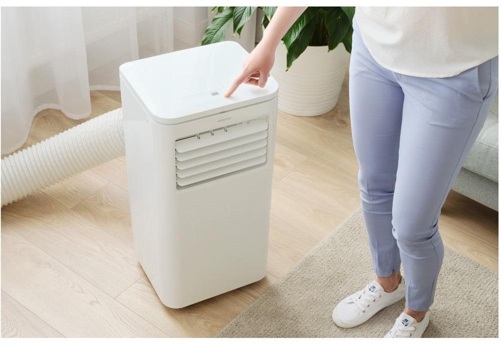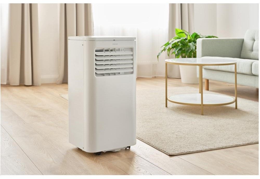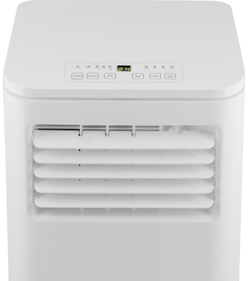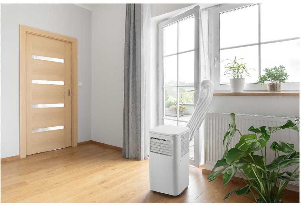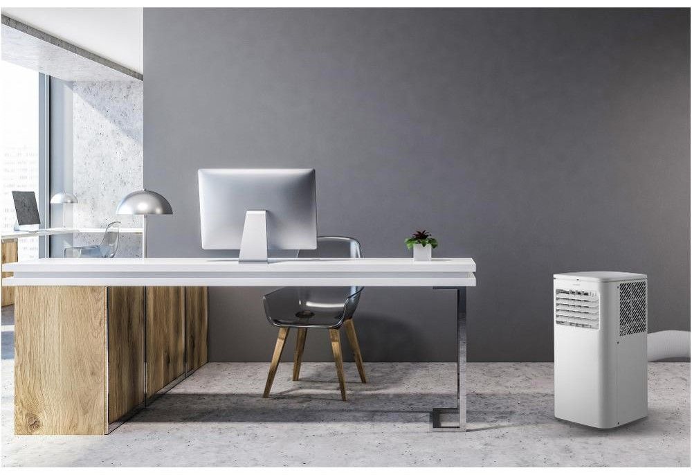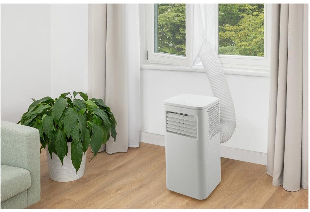 Mobilní klimatizace vhodná pro místnost o ploše 26m2, má 3 režimy provozu, 2 úrovně nastavení rychlosti ventilátoru, LED displej a dálkové ovládání s LCD displejem.