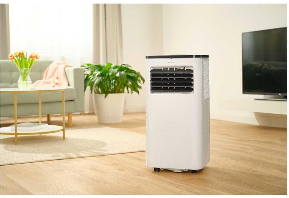Mobilní klimatizace vhodná pro místnost o ploše 26m2, má 3 režimy provozu, 2 úrovně nastavení rychlosti ventilátoru a dálkové ovládání s LCD displejem.