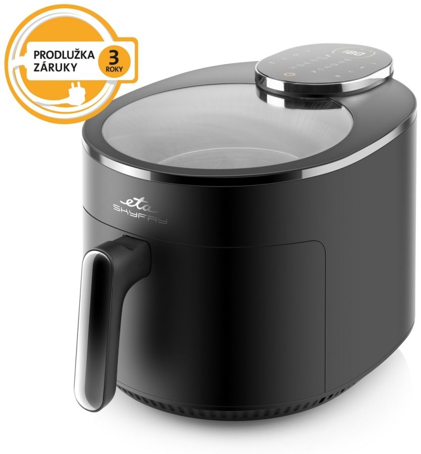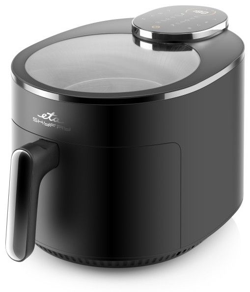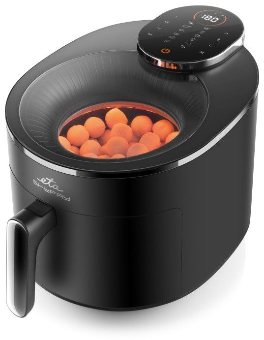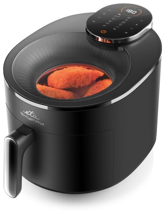Dopřejte si smažené dobroty bez výčitek! Horkovzdušná fritéza ETA SkyFry s praktickým průhledným horním krytem „smaží“ jídlo pomocí horkého vzduchu a infračerveného topného tělesa, a to rovnoměrně ze všech stran. Díky velké 5litrové nádobě s fritovacím roštem připravíte šťavnaté kuřecí steaky, dozlatova usmažené hranolky, domácí falafel i křupavou zeleninu – a to s minimem přidaného tuku.