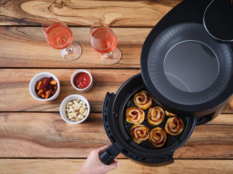 Horkovzdušná fritéza zajišťuje systém fritování bez použití oleje. Objem fritovacího koše 5 l.