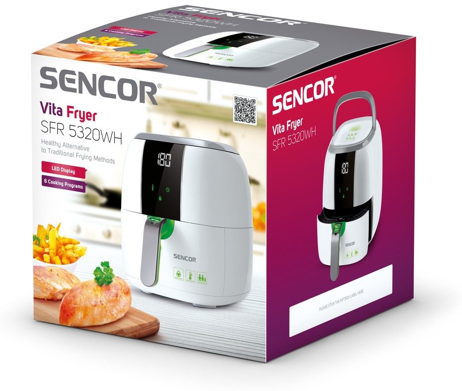 Jsem Sencor horkovzdušná fritéza SFR 5320WH. Vyhotovím super smažená i nesmažená jídla, aniž byste museli přidat kapku tuku. Využívám technologii cirkulace horkého vzduchu a veškerá jídla připravím rovnoměrně. Pokrmy chutnají jako právě usmažené, ale jsou o dost zdravější! Jídlo má mnohem méně kalorií a cholesterolu, proto se nemusíte bát o zdraví ani svou figuru.