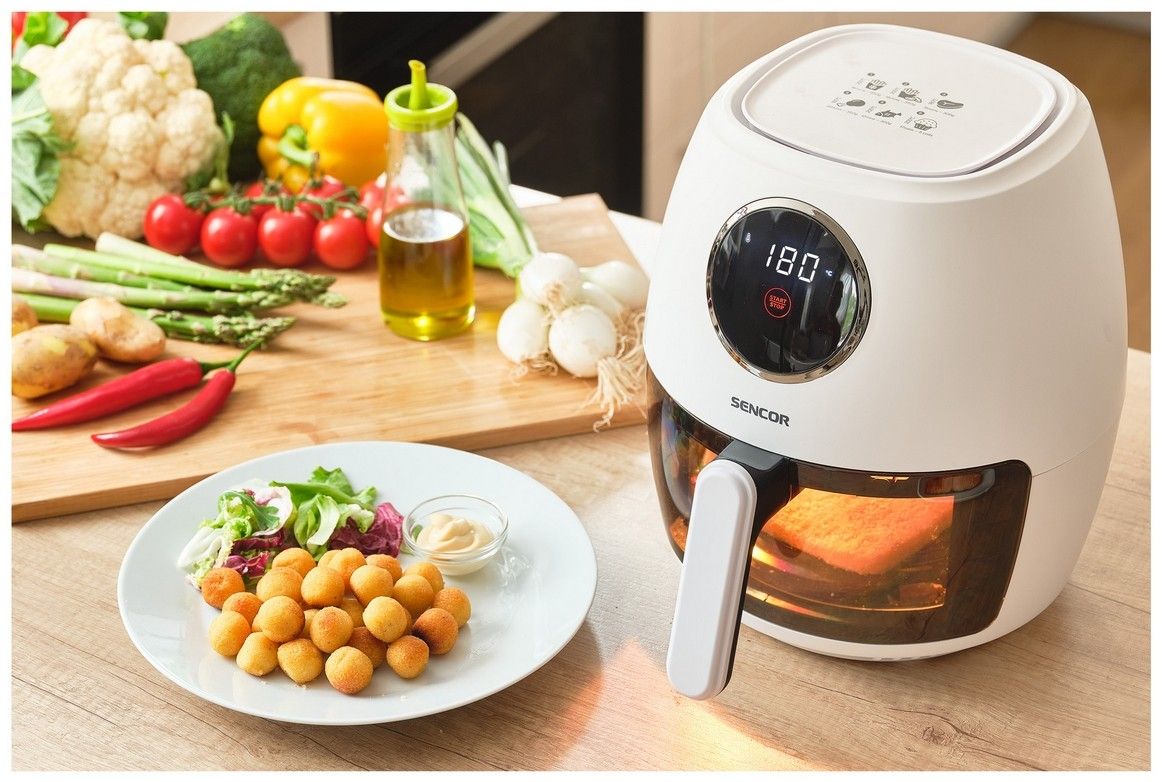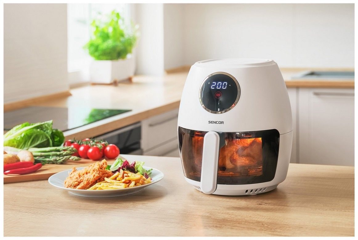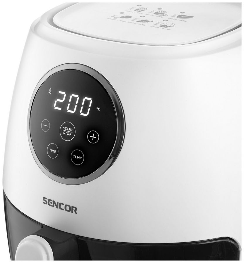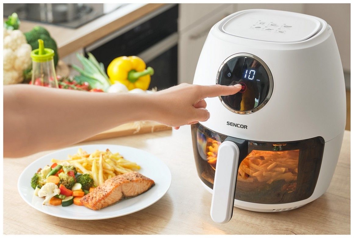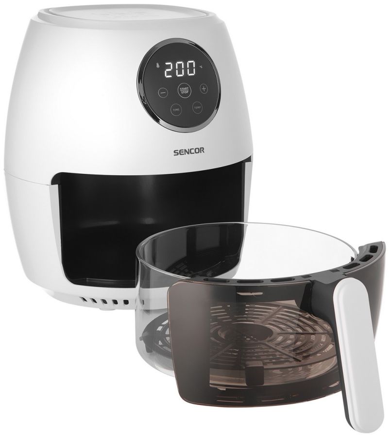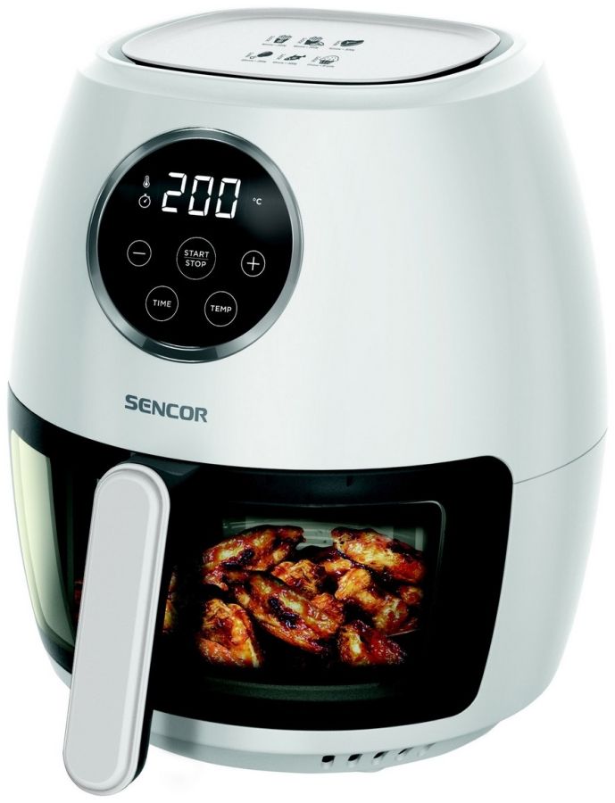 Horkovzdušná fritéza zajišťuje systém fritování bez použití oleje. Objem fritovacího koše 3,5 l.