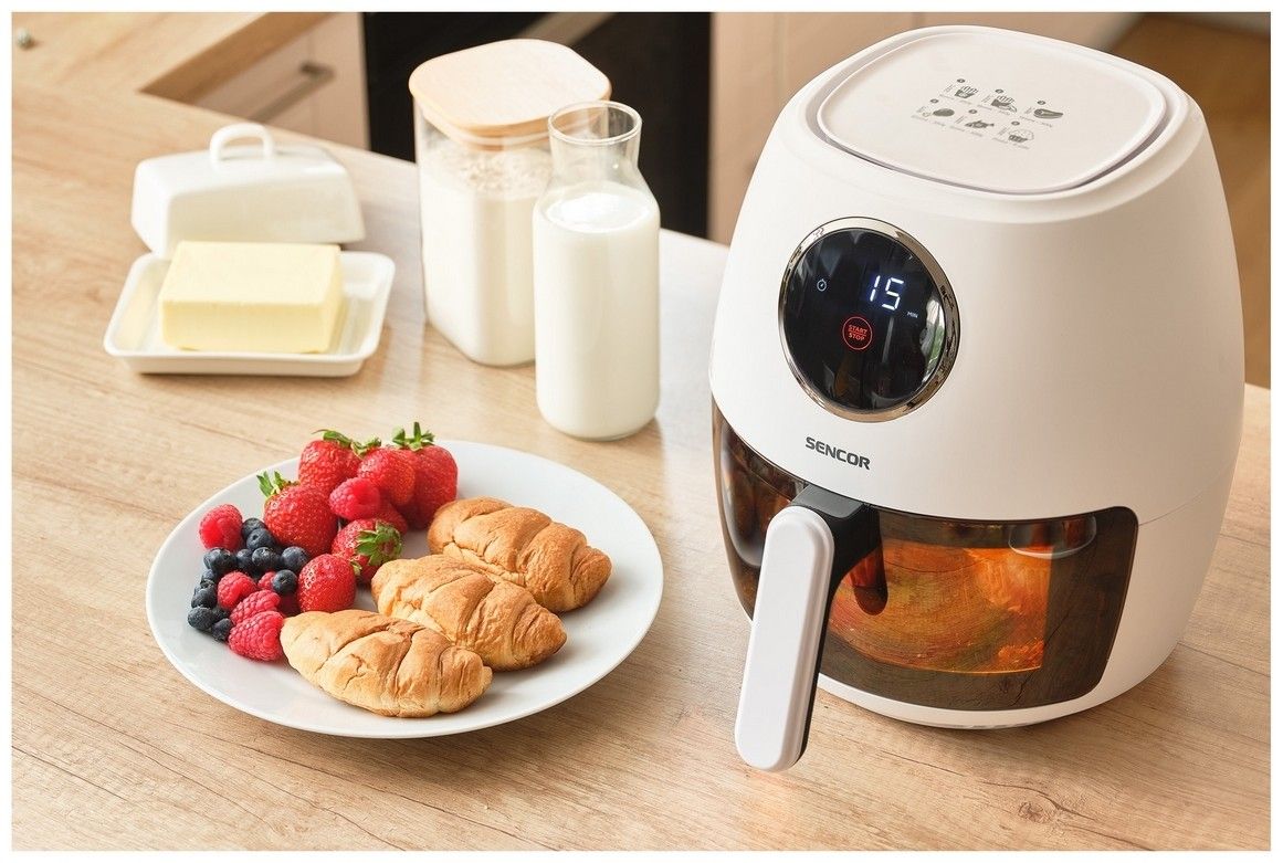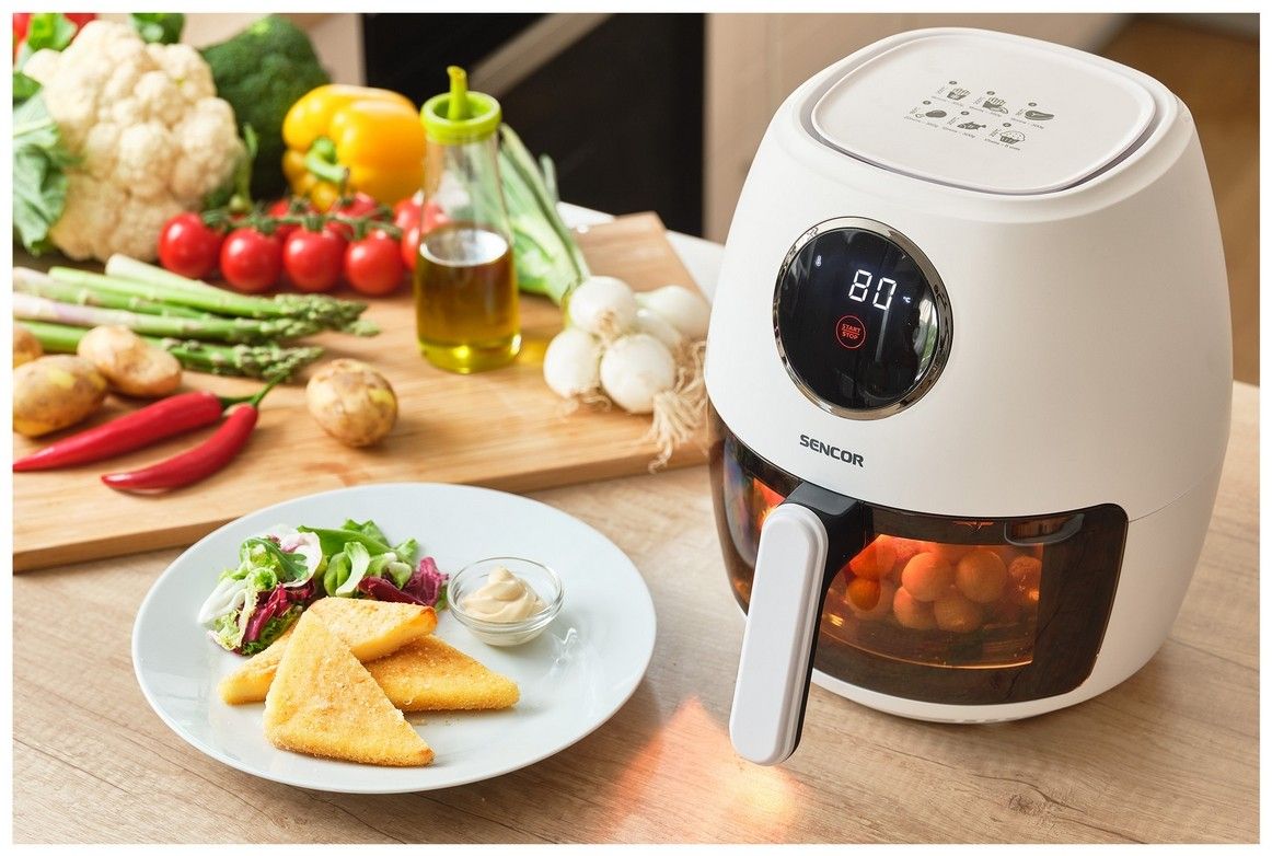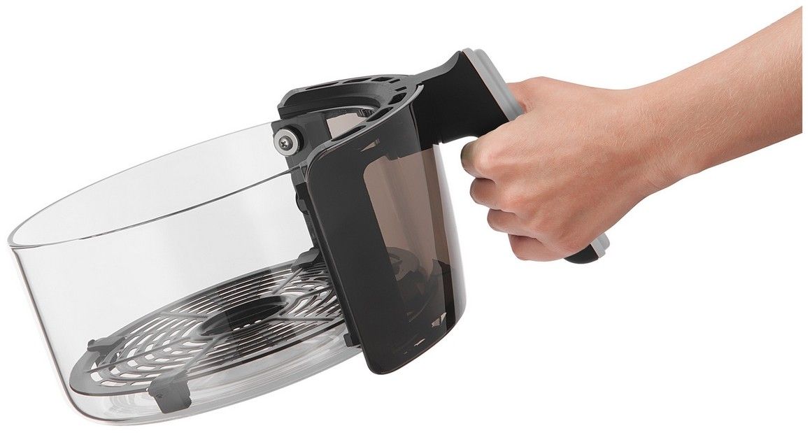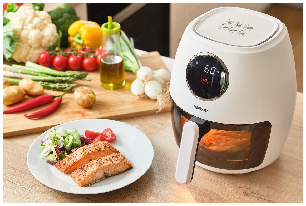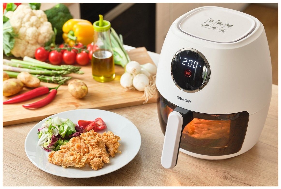 Horkovzdušná fritéza zajišťuje systém fritování bez použití oleje. Objem fritovacího koše 3,5 l.
