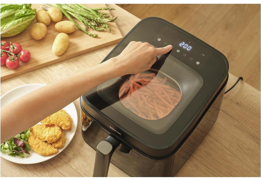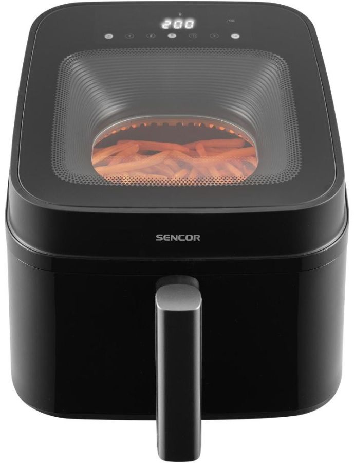Horkovzdušná fritéza Sencor SFR 6900BK je vybavena velkým náhledovým oknem umístěným v její horní části. K vaření fritéza využívá důmyslnou technologii cirkulace horkého vzduchu. Tradičně smažené pokrmy tak připraví mnohem zdravěji s minimem oleje a bez nepříjemného zápachu. K dispozici je koš o objemu 6,5 l. Intuitivní obsluhu zajišťuje dotykový LED displej.