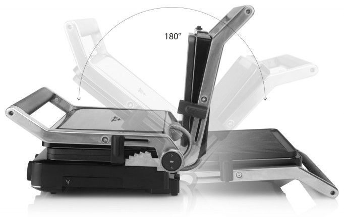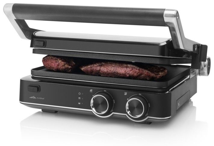 Vrchní desku lze nadzvednout v 5 úrovních. Snadno tak ugrilujete na tenko nakrájenou zeleninu, pořádný kus masa i oblíbený grilovaný sýr. Teplotu si nastavíte pomocí dvou otočných koleček a díky světelným kontrolkám budete mít stále přehled o všem, co se děje.