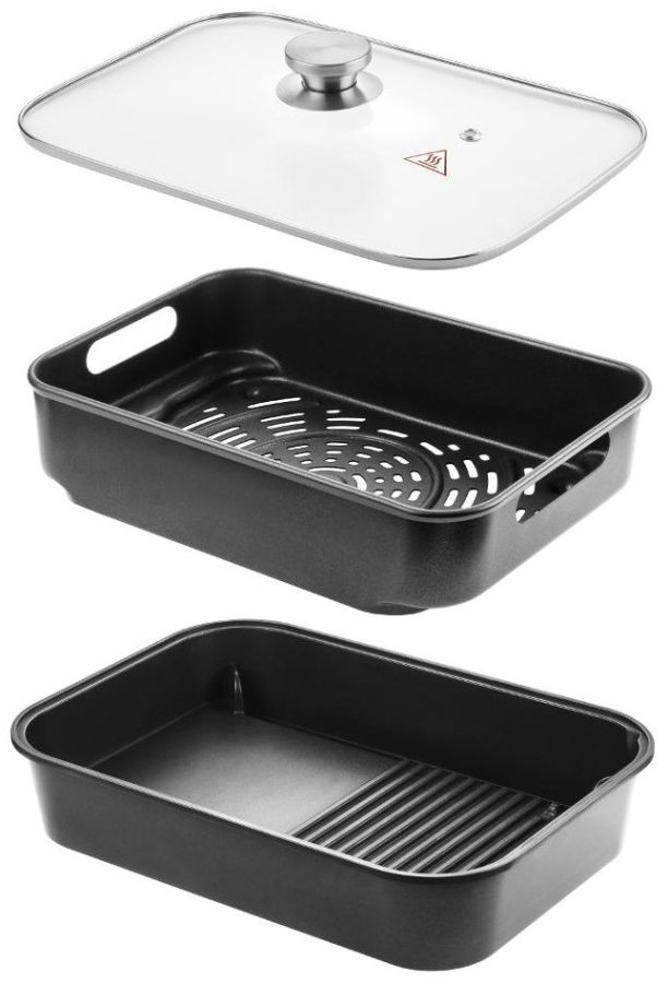 Je vybavena horním konvekčním topným tělesem a spodní topnou deskou s nepřilnavým povrchem, díky vnitřnímu osvětlení a velkému průhledu můžete sledovat krok po kroku průběh přípravy. Po dokončení nastaveného programu či zvolené funkce se fritéza automaticky vypne. Po vychladnutí všechny vyjímatelné části snadno umyjete. Doba přípravy zvoleného pokrmu je kratší s výrazně menší spotřebou energie než při rozehřátí trouby.