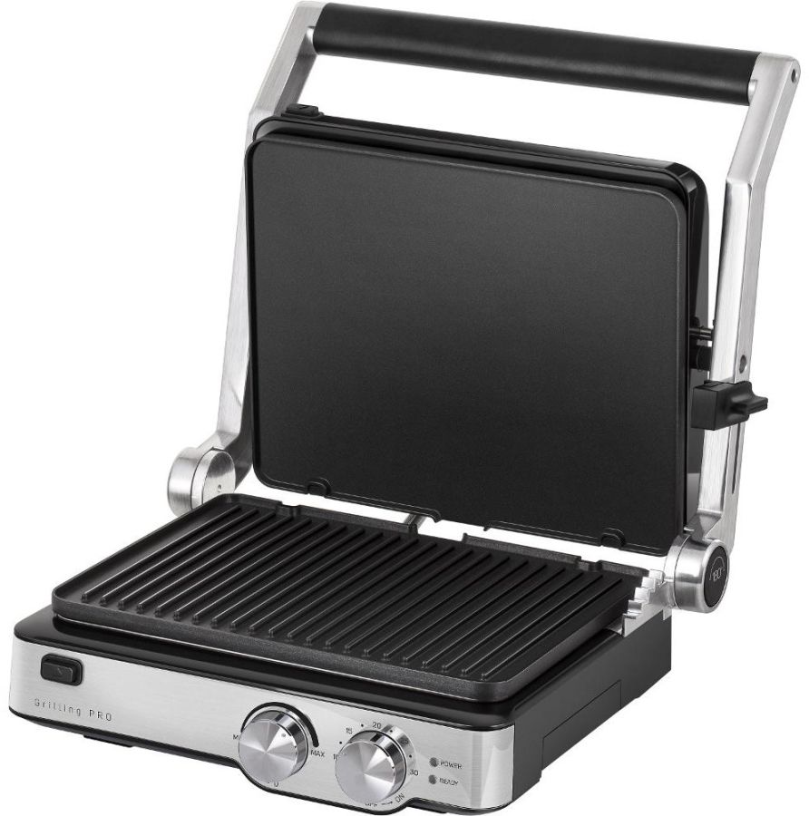 Gril lze využívat ve 3 různých provozních polohách. Gril otevřete do polohy 90° a využíváte jen spodní pečicí plát. U grilování většího množství jídla naráz využijete otevřený gril v úhlu 180° a máte tak k dispozici dvojnásobnou plochu. U zavřeného grilu se hodí nastavitelná výška horní desky, kterou ukotvíte dle potřeby bočním ovladačem.