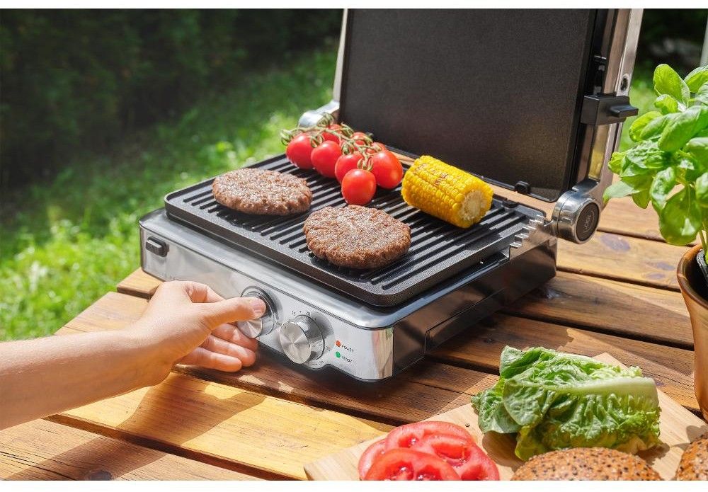 Zagrilujte si pohodlně v každém ročním období, nezávisle na počasí. Víceúčelový elektrický gril Sencor SBG 4010SS s termostatem a časovačem je přenosný a skladný. Dá se použít jak v domácích podmínkách, tak venku na terase, nebo ho zabalte na dovolenou. Díky vyjímatelným grilovacím plátům s nepřilnavým povrchem připravíte šťavnaté hamburgery, steaky, lahodné uzeniny a křupavou zeleninu bez připalování. Určitě uvítáte nastavení výšky horní desky pro zapékání vyšších sendvičů nebo možnost rozevření grilu do roviny o 180°. Tuk z pečení se sbírá do speciální misky, tím pádem je jídlo zdravější. Oceníte i světelné kontrolky provozu a připravenosti k použití. Snadná údržba grilu a povrch CoolTouch, který předchází popáleninám, je další výhodou tohoto pomocníka.