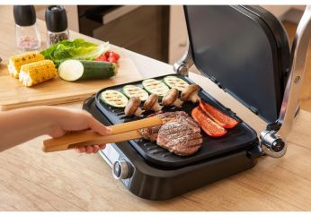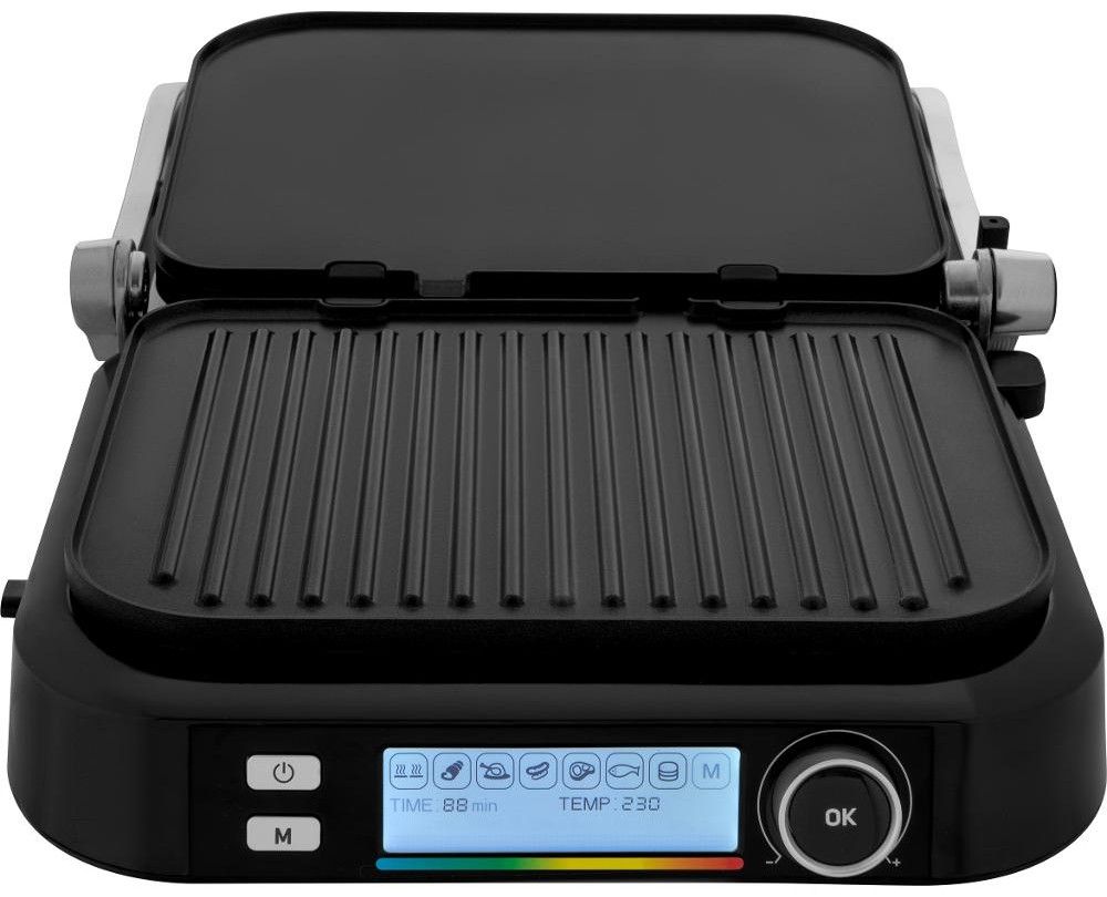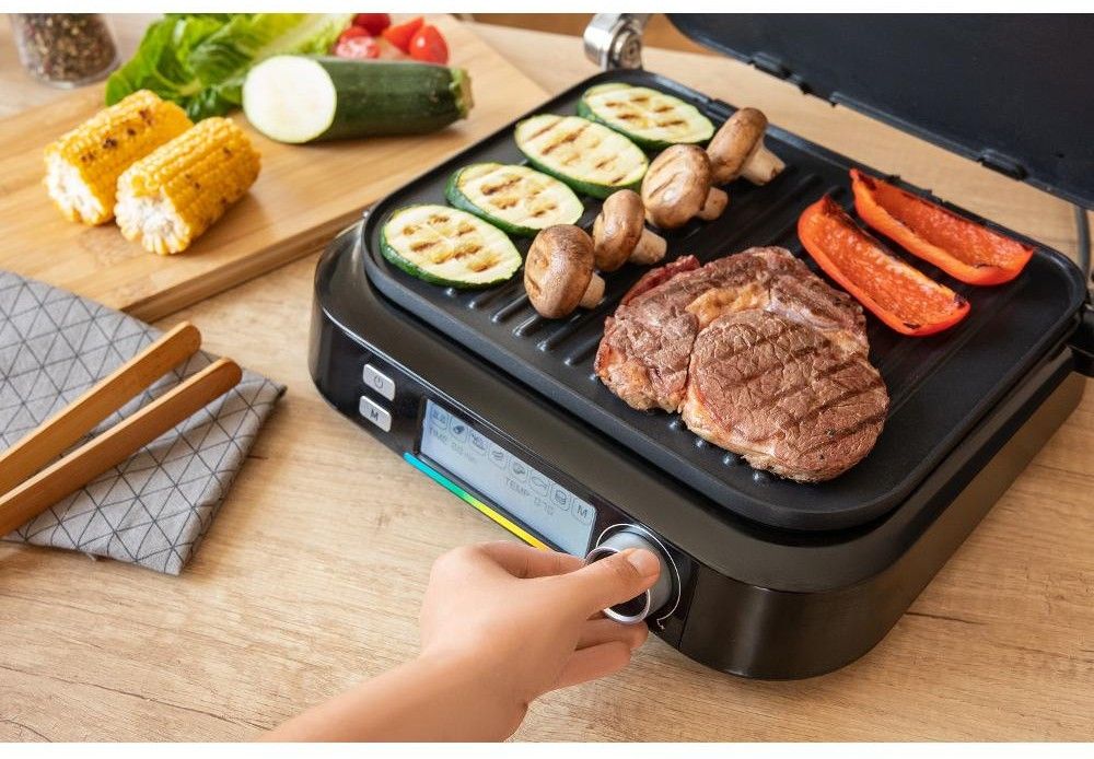 Kontaktní víceúčelový elektrický gril s možností grilování bez nutnosti přidávání oleje a LCD displejem.