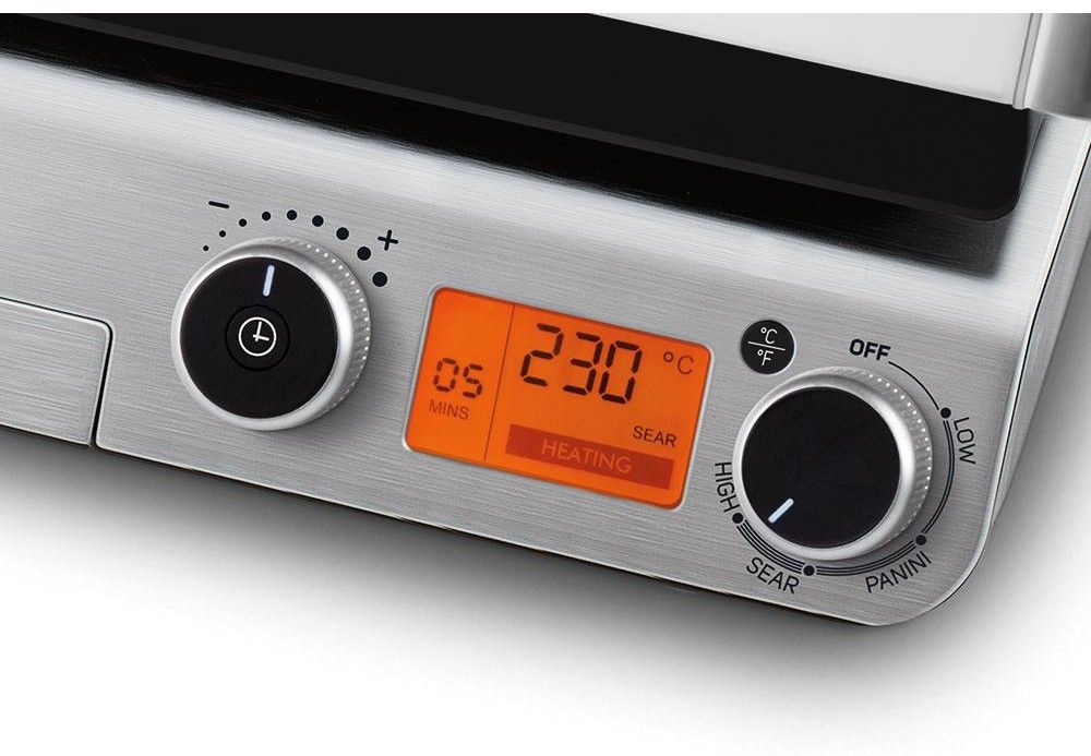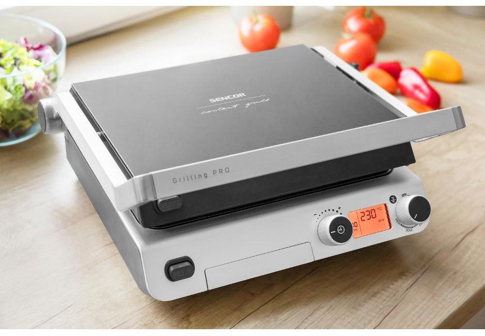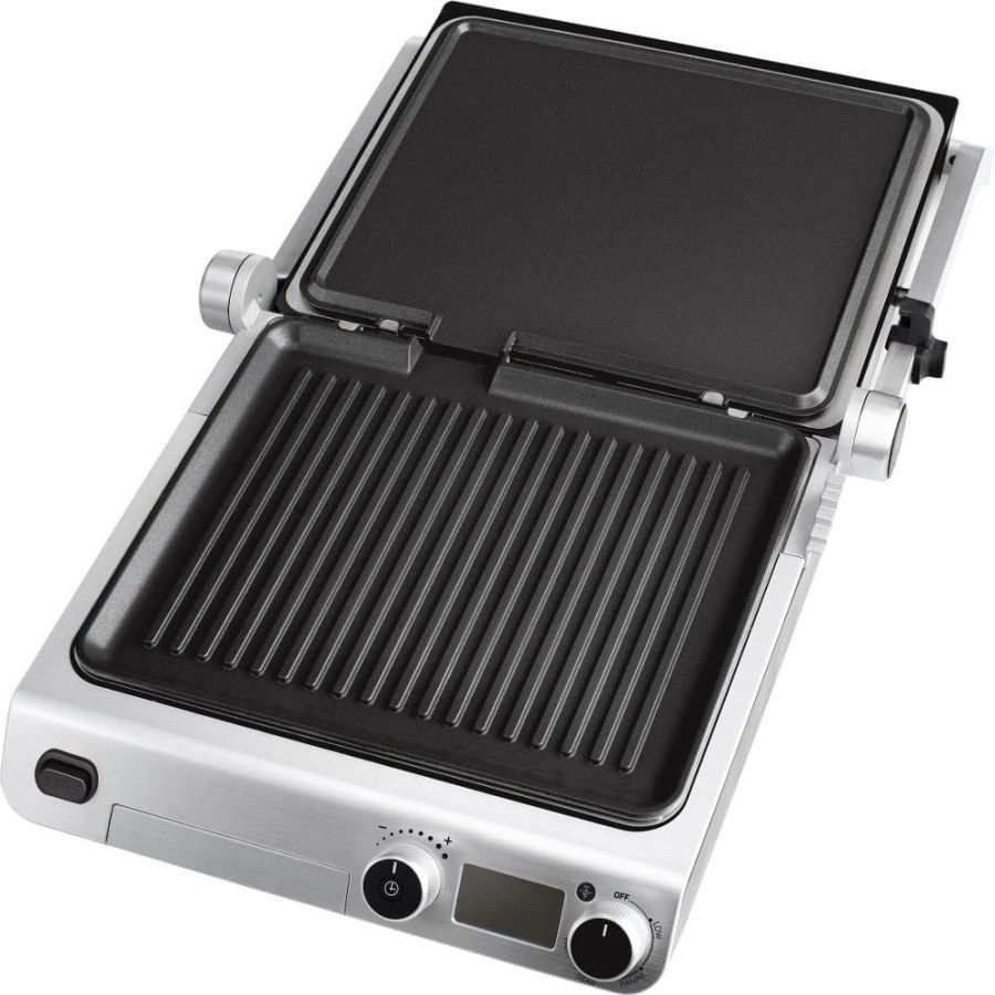 Kontkatní gril má exkluzivní skleněný design, digitální ovládání s displejem pro pohodlnější a preciznější grilování a nepřilnavé grilovací desky 3rd Generation s integrovanou topnou spirálou.