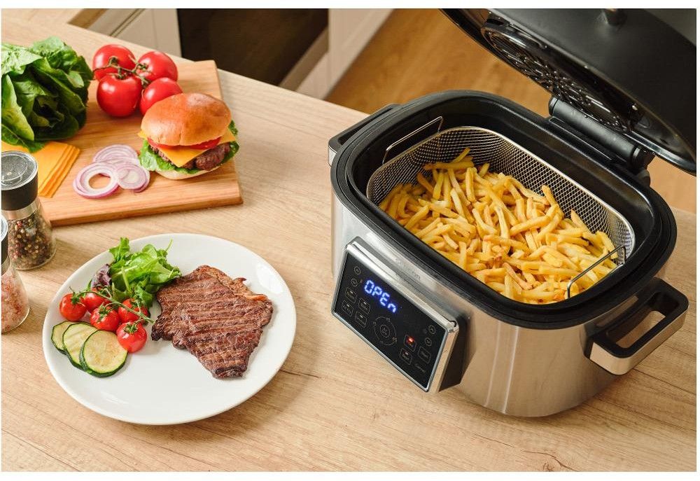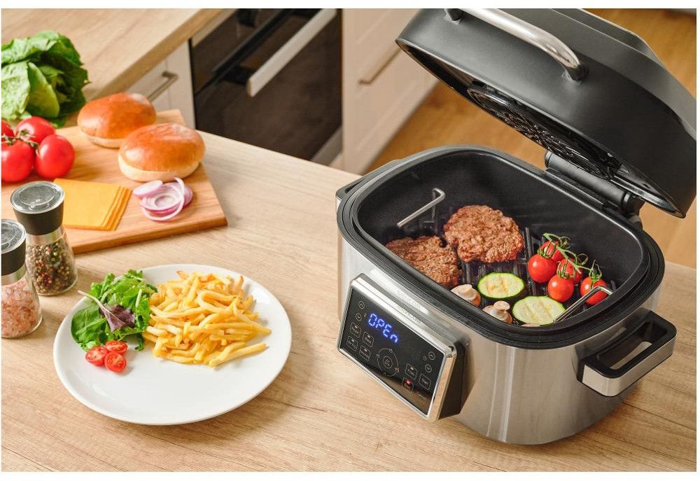 Multifunkční hrnec+gril s objemem 6 l, 7-mi volitelnými programy, širokým rozsahem teplot a vyjímatelnou nádobou s nepřilnavým povrchem.