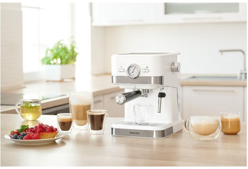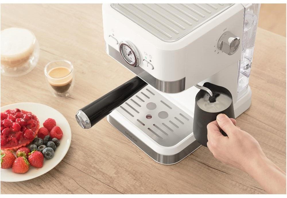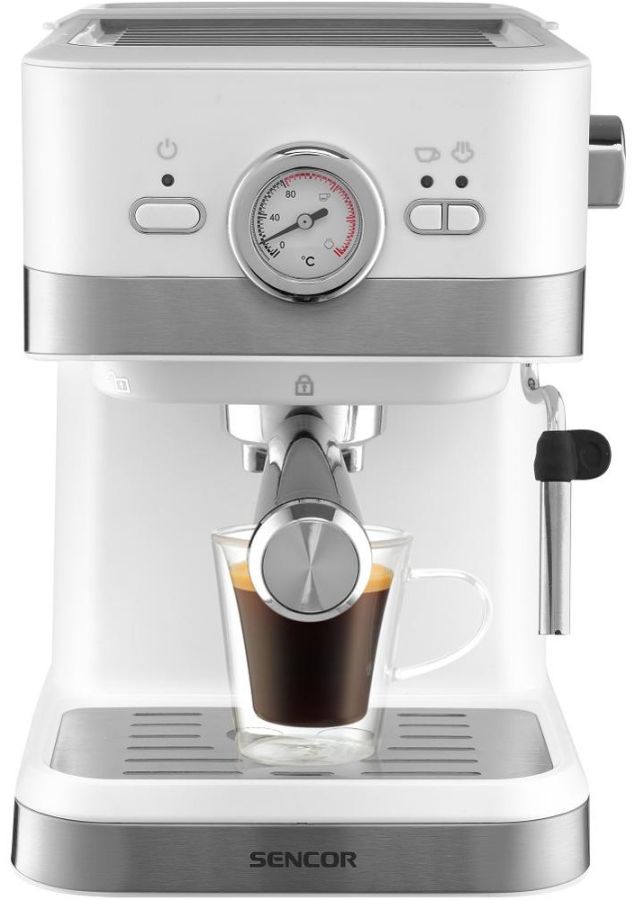 Pákový kávovar Sencor SES 1720WH v elegantní bíle barvě se výborně hodí do každého interiéru. Vyniká svými kompaktními rozměry a vysoce výkonným tlakovým čerpadlem o síle 20 barů. Ovládání je opravdu jednoduché a kávovar vám dopřeje variabilitu výběru kávy na každý den. Zabudovaný budík vám přehledně ukáže aktualní teplotu vody během extrakce. Funkce předspaření vykouzlí chuť kávy jako v pravé italské restauraci. Páka je navíc opatřena kvalitním nerezovým portafiltrem. Přístroj vám našlehá hedvábnou mléčnou pěnu s 360° otáčivou tryskou na páru, nebo připraví horkou vodu na zalití Americana.