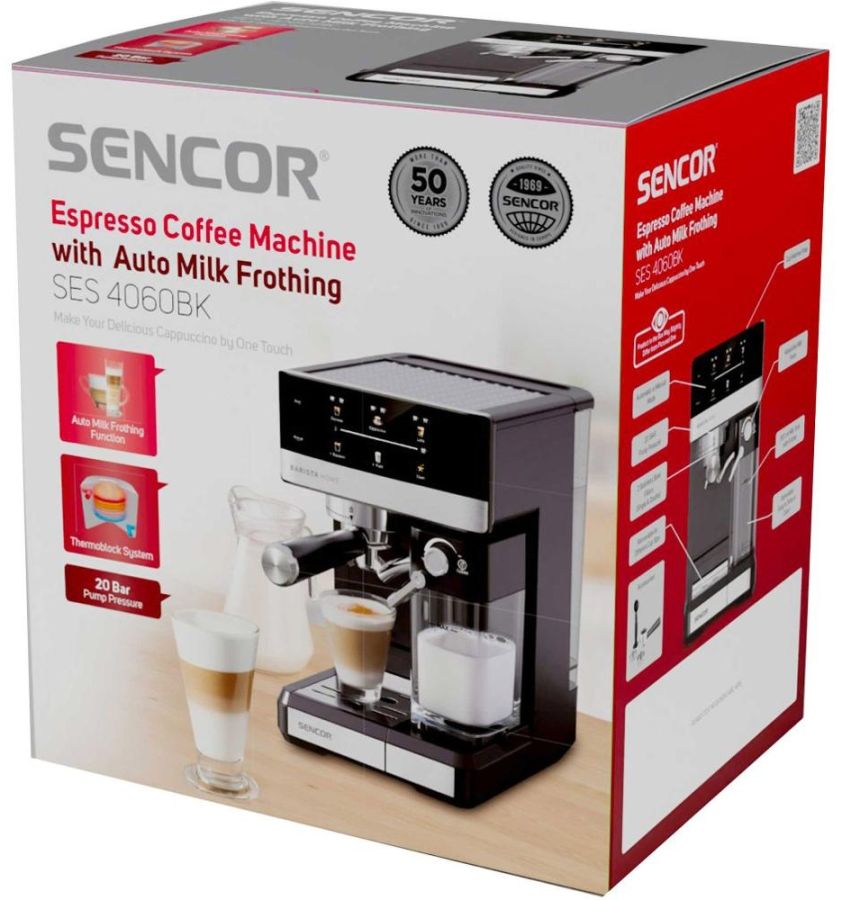 Pákový espresso kávovar s tlakem čerpadla 20 barů, digitálním displejem s barevnými ikonami, systémem ohřevu Thermoblock, nádržkou na vodu 1,8 l a funkcí automatického vypnutí.