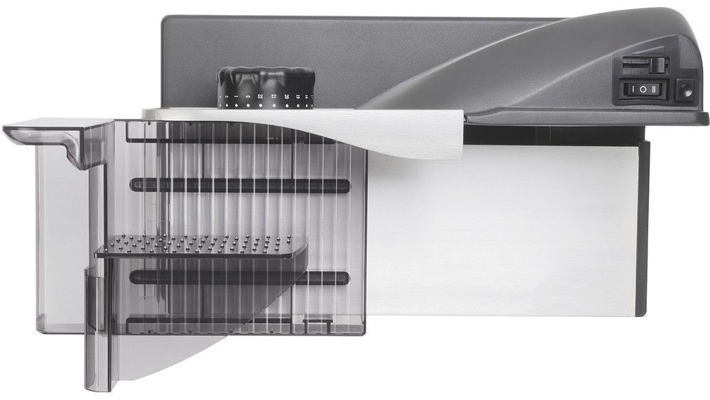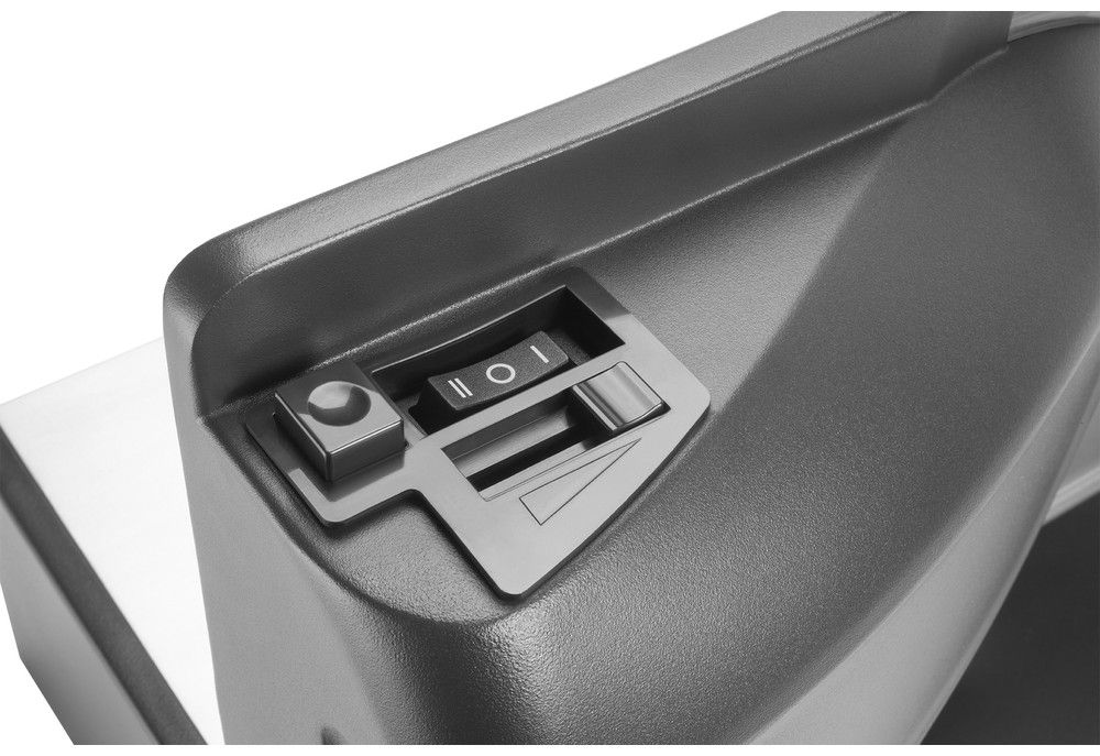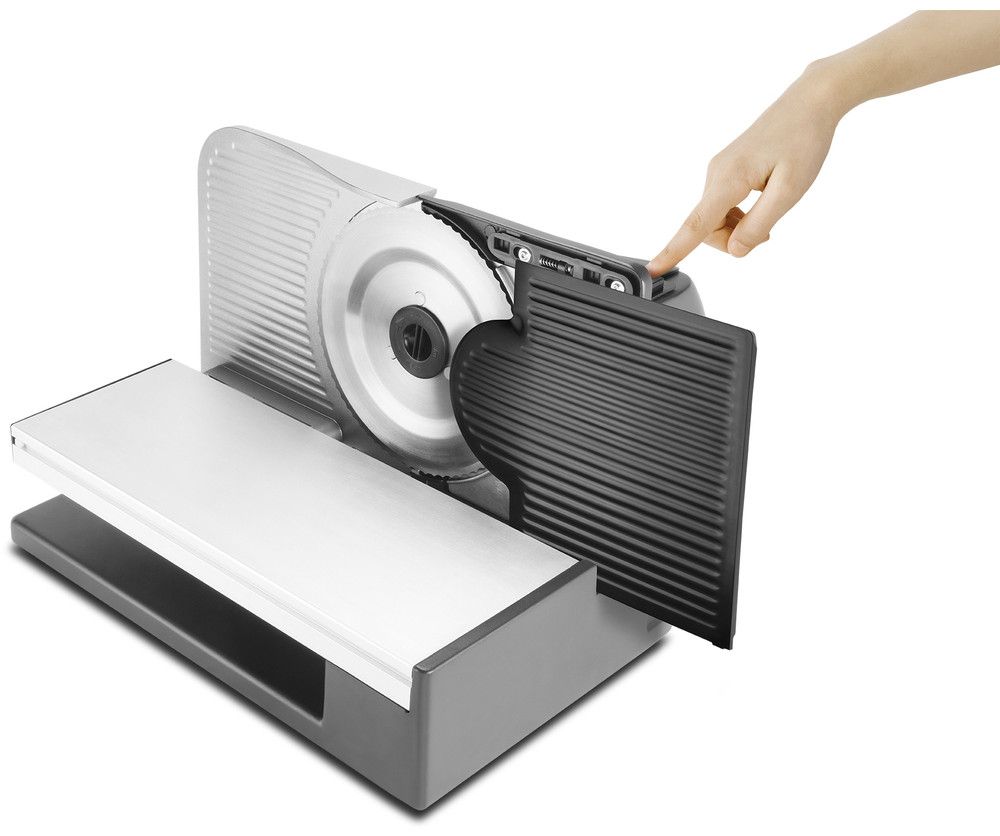 Velikost plátků je možné nastavovat v šířce od 0 - 22 mm pomocí velkého otočného knoflíku. K bezpečnosti pak přispívá podavač s chráničem prstů, protiskluzové nožky, nebo pulzní chod.
