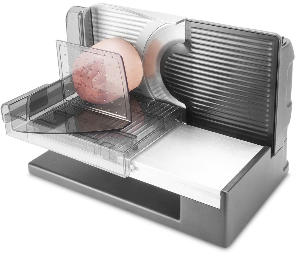 Elektrický celokovový kráječ potravin s 2 nerezovými odnímatelnými krájecími kotouči a otočným regulátorem pro plynule nastavitelnou šířku řezu 0-22 mm.