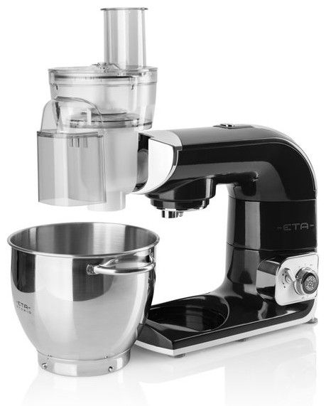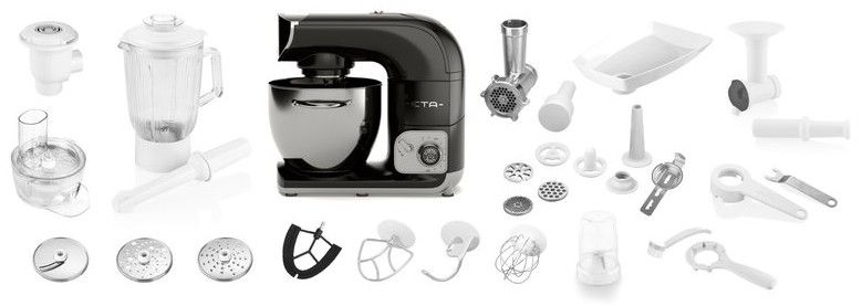 Bohaté příslušenství: Velkokapacitní nerezová mísa o objemu 5,5 l, včetně průhledného krytu (až 2,5 kg těsta), Hnětací hák, Šlehací metla, Mísící metla, Klíč pro snadné nastavení optimální výšky nástavců v míse, Flexi metla (na krémy a lehká těsta), Skleněný mixér 1,4 l (nepohlcuje pachy a barvy mixovaných potravin), Pěchovadlo pro posun větších kusů surovin do prostoru sekacího nože, odměrka 40 ml a uvolňovací klíč, Nástavec na strouhání se 3 diskovými struhadly + převodovka pro zajištění optimálních otáček, Mlýnek na maso o průměru 62 mm (4 velikosti mlecích destiček, nástavec na výrobu uzenin, nástavec na výrobu Kebbe, tvořítko na cukroví, pěchovadlo, násypka, uvolňovací klíč), Nástavec na výrobu domáci zmrzliny, ledového krému a mraženého jogurtu, Multifunkční sekáček potravin