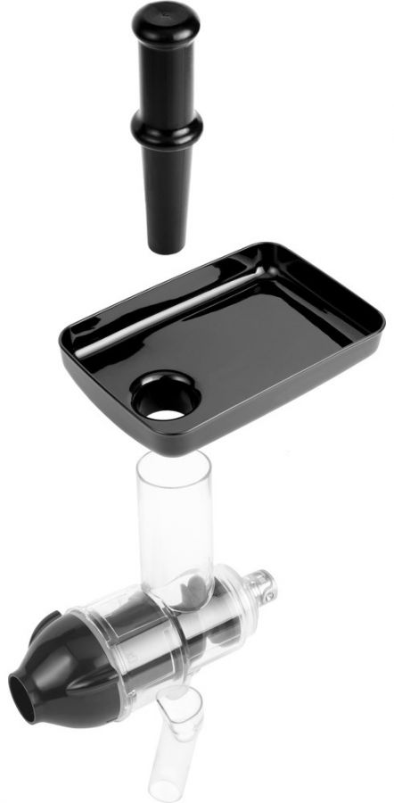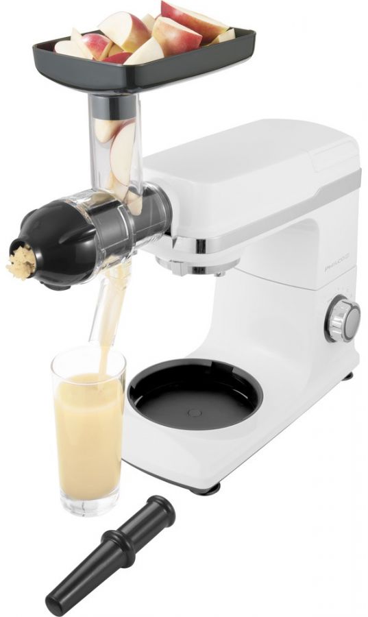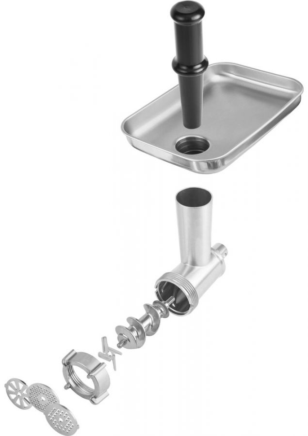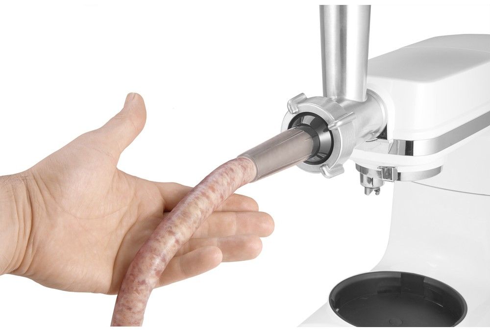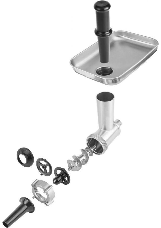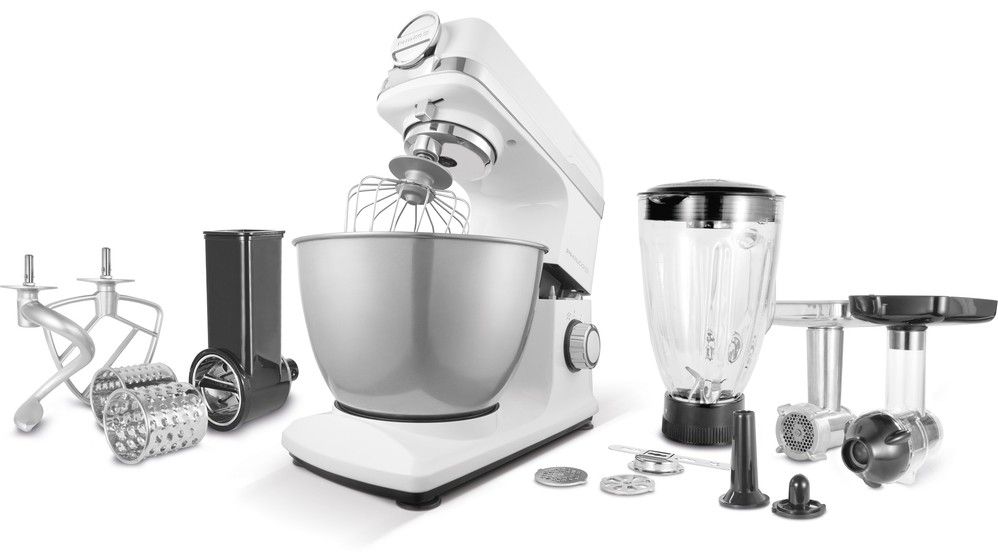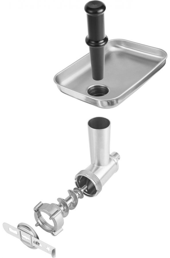 Bohaté příslušenství: Šlehací metla, Plochá metla, Hnětací hák, Mlýnek na maso (s nástavci pro plnění klobás a párků + tvořítko na cukroví), Skleněný mixér (objem 1,5 l), Struhadlo (se 3 nástavci), Lis na ovoce (systém pomalého odšťavnění), Kryt kovové nádoby