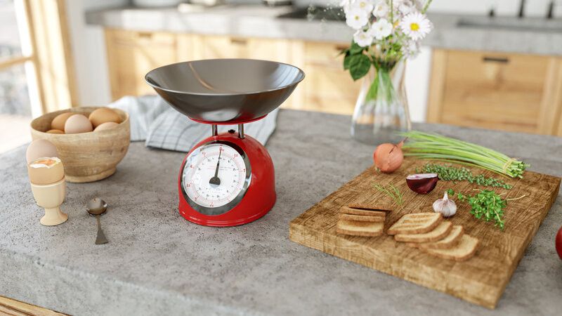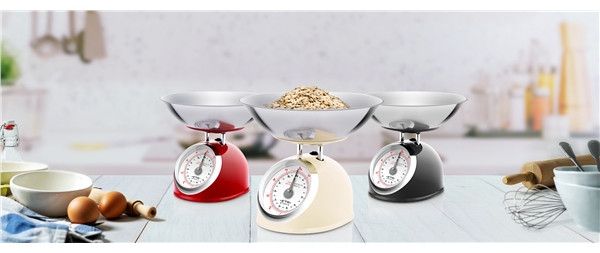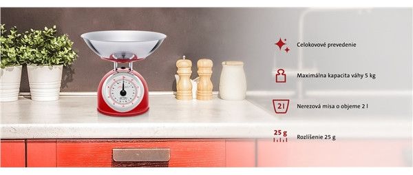 Kuchyňská váha v elegantním retro stylu s nerezovou mísou o objemu 2 litry.