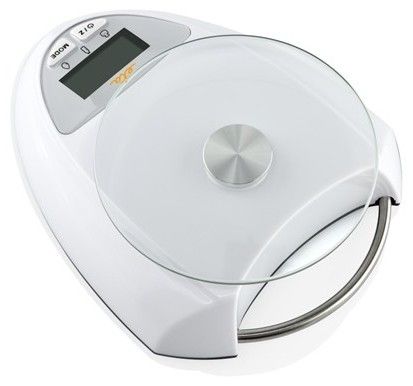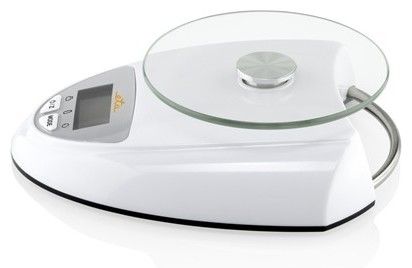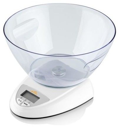 Digitální kuchyňská váha s plastovou mísou o objemu 2 litry, pro vážení jak pevných a sypkých surovin, tak i vody nebo mléka.