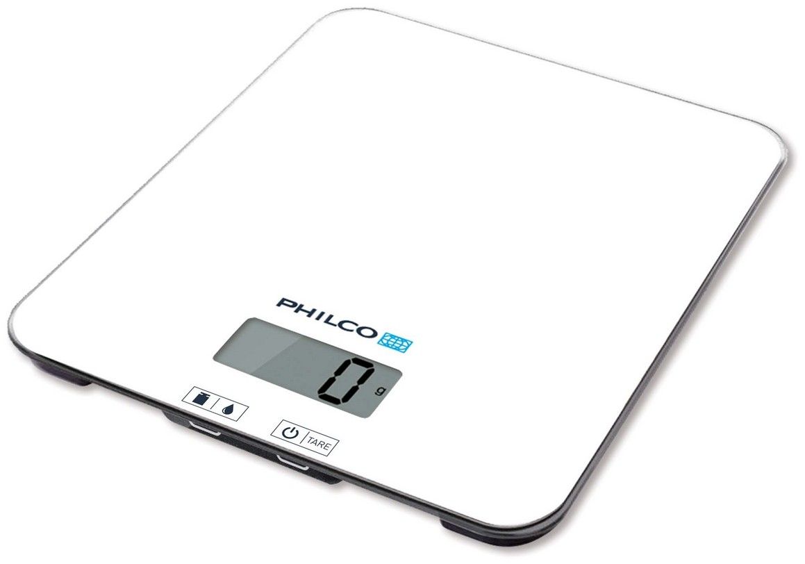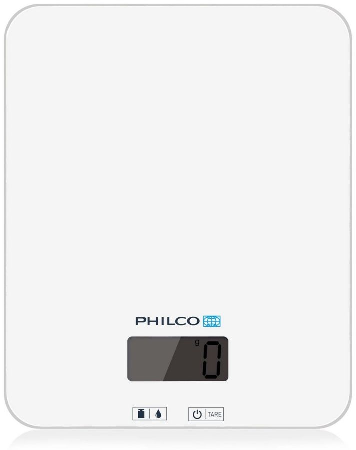 Digitální kuchyňská váha Philco PHKS 4510 v čistém minimalistickém designu s přehledným modře podsvíceným displejem.